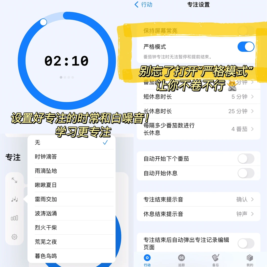 3⃣️番茄时钟,设置“严格模式”,让你不想卷都不行~