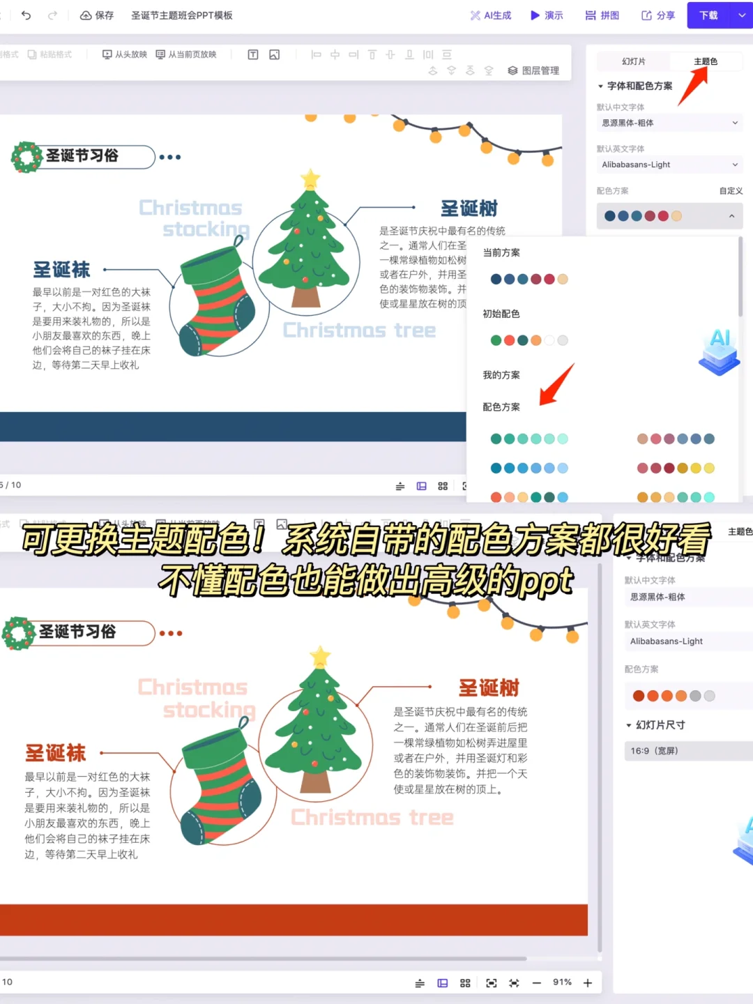 [绿色心形R]还能选择主题配色,系统自带的配色方案高级好看!不会配色的姐妹都能设计出好看的ppt