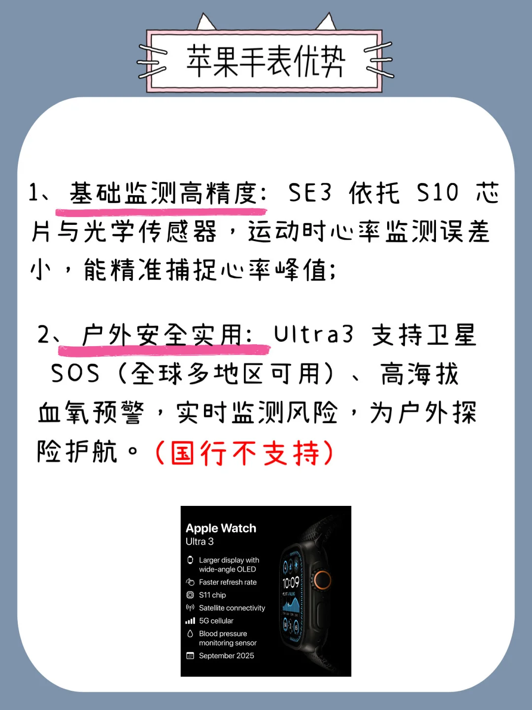 🌟户外场景的健康需求,华为 WATCH Ultimate 非凡探索侧重户外专属健康监测 + 长续航—— 户外探险可以实时追踪心率,钛金属材质耐摔,满电可支持 10 天全天监测,适合经常露营、登山、潜水的户外爱好者,不用频繁充电;苹果 Ultra3 侧重户外急救辅助 + 高海拔血氧预警,卫星求救功能更偏向应急,但国内不支持使用。S11 和 SE3 的户外健康功能则相对基础,续航也多在 2 天内,更适合城市户外使用。