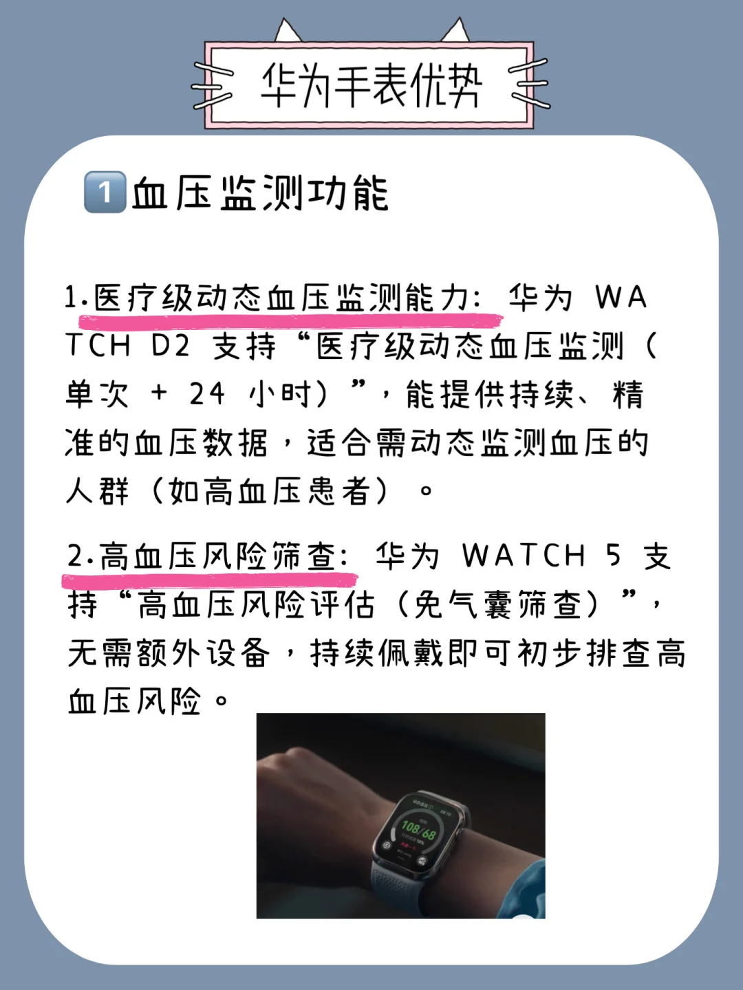 🌟血压管理。华为这边,WATCH D2 侧重医疗级 24 小时动态血压监测,数据能同步给医生,适合需要长期管理血压的人群(比如高血压患者);WATCH 5 则侧重高血压风险筛查,没确诊但担心血压问题的宝子,日常用它做初步排查很方便,借助它侧面的X-TAP智感窗和佩戴数据,就能给出我们的血压均值范围。苹果这边,刚发布S11 和 Ultra3 虽然支持了高血压风险评估,但不能给出数值。