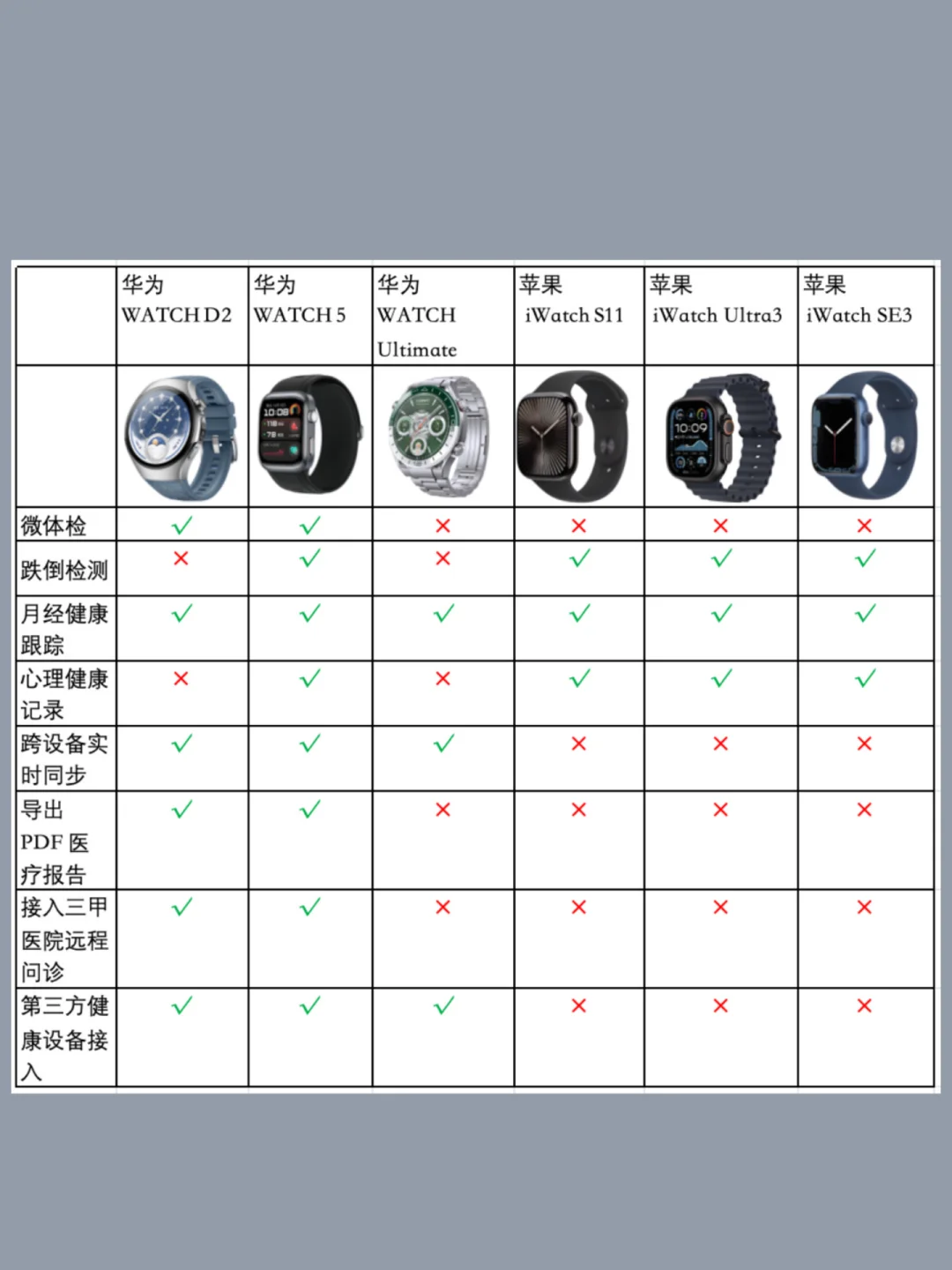 🌟日常健康守护方面,华为 WATCH 5 侧重日常的健康监测,像指尖实时血氧 ,心率检测,情绪健康、HRV ,血压、血糖风险评估都可以做到分析。侧面的X-TAP,手指贴10 秒出血氧结果,压力大时引导深呼吸放松,久坐还会推送伸展动画,很贴合打工人、学生党的日常需求;WATCH D2 的健康功能更专业,像感冒前兆、身体疲劳都会提前提示,覆盖更全面。苹果的 S11 和 Ultra3 侧重睡眠 + 体温基础监测,SE3 侧重基础心率 + 睡眠记录,能满足日常简单的健康数据查看需求。