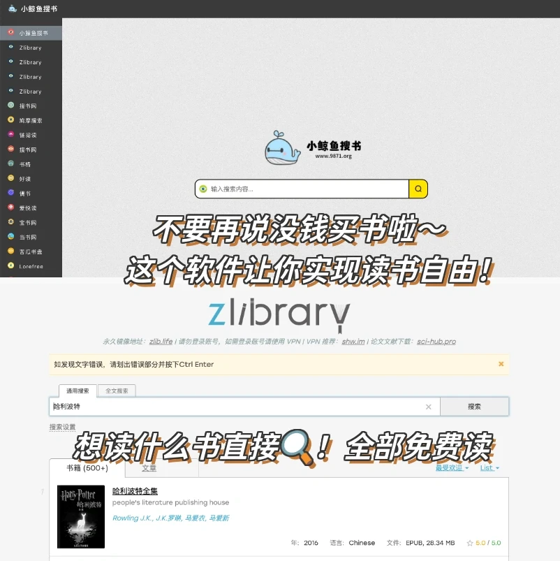 ❤️网站:小鲸鱼搜书📖 ❤️设备:浏览器直接🔍 🌟一个好用的免费读书网站! 🌟内置20多个读书导航,基本满足你全部阅读需求~ 🌟可以下载多种格式!也可以直接导入kindle读书,电子书完全不用愁! 🌟学生党冲啊!真的太香了~