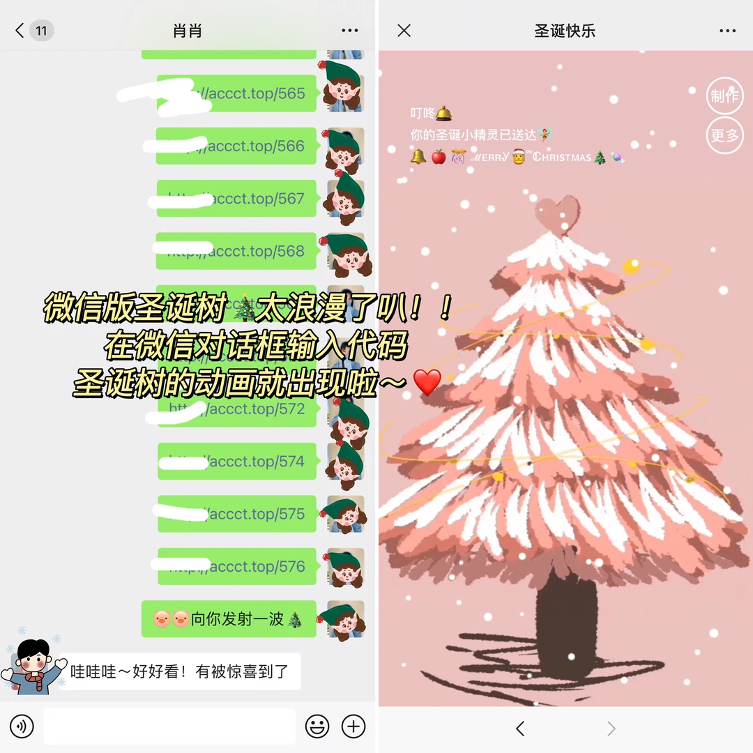 🎄圣诞节就到啦~属于微信的浪漫🌹 🎄有对象有好朋友的一定要安排起来!真的好梦幻! 🎄希望每一个看到的人都平安健康,心想事成![红色心形R] - 🎄教程: 在vx对话框输入:acct.top/ +(数字566-576任意一个就能生成圣诞树啦)