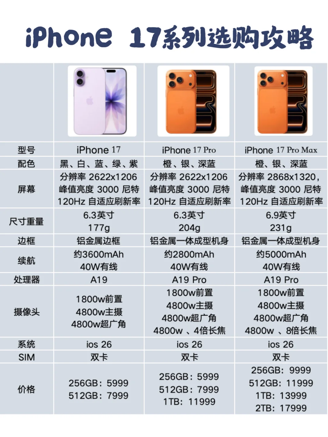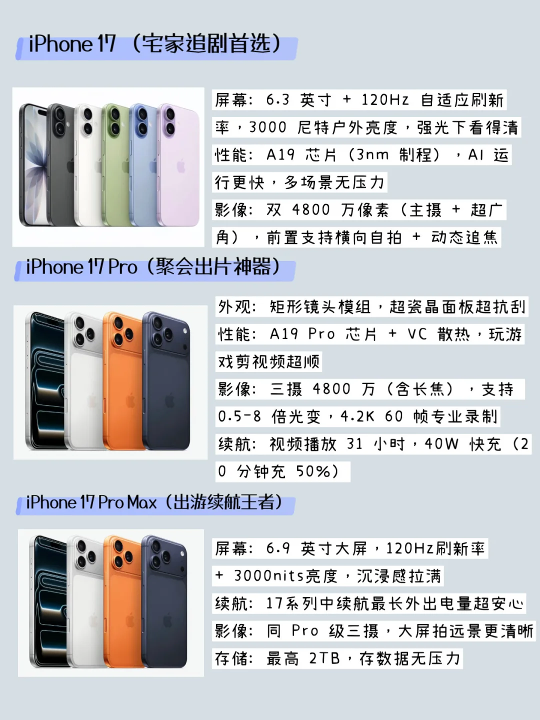 [黄色心形R]iPhone 17:6.3 英寸 120Hz 屏,强光下也清晰;A19 芯片 AI 运行快;双 4800 万像素 + 前置动态追焦,自拍发圈超赞~