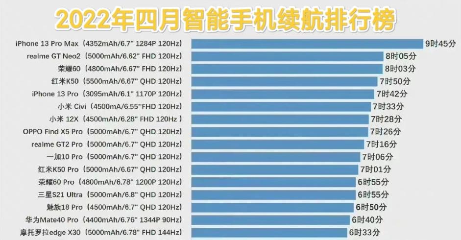 2022智能手机续航哪家强?苹果第一,第二三四名都是不到3000的国产中低端! 智能手机更新迭代实在太快了,几乎每隔十天左右又一个新品发布会,堆料配置也是越来越卷。最近有数码博主发了4月份智能手机续航的排行榜,我有点震惊,苹果13 pro max续航以9小时45分第一,这个排名毋庸置疑,估计这个榜首宝座还可以坐很久。倒是第二、第三、第四名居然都是国产中低端品牌,而且售价都不超过3000。 第二名是realme GT Neo2,续航时间为8小时05分,屏幕为1080P 120Hz的高亮度E4高刷新率屏幕,搭配6400 万主摄像头、800 万超广角镜头、200 万微距镜头,5000毫安大电池及65W闪充,1999元起。 第三名是荣耀50,续航时间为8小时03分,屏幕为OLED材质的120Hz刷新率屏幕,搭配10800万主镜头、200万景深镜头、200万微距镜头,4300毫安电池及66W闪充,2499起。 第四名是redmi k50,续航时间为7小时50分,屏幕为三星2K(3200×1440)120Hz刷新率的 AMOLED屏幕,搭配4800万主摄、800万超广角摄像头;200万微距摄像头。搭配5500mAh大电量电池及67W快充,2399起。 没想到国产中低端手机这波这么争气,直接紧咬苹果。虽然我们国产智能手机一时半会还是赶不上苹果,但这也是一种非常好的现象了。