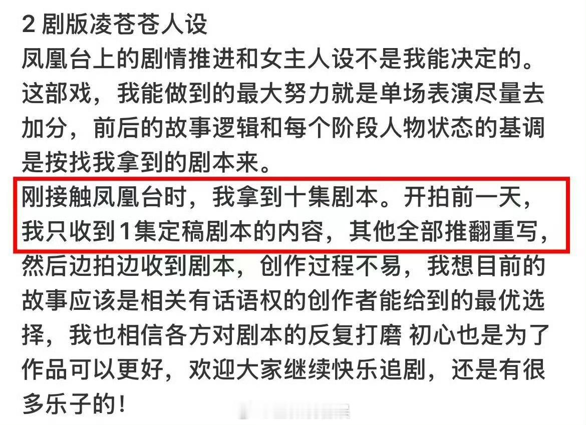 彭小苒发布长文回应争议,透露拍摄《凤凰台上》时剧本是边拍边收。尽管开拍前只拿到1集定稿,但她理解创作团队追求完美的用心。这种对艺术创作的尊重,体现了一个专业演员的格局。