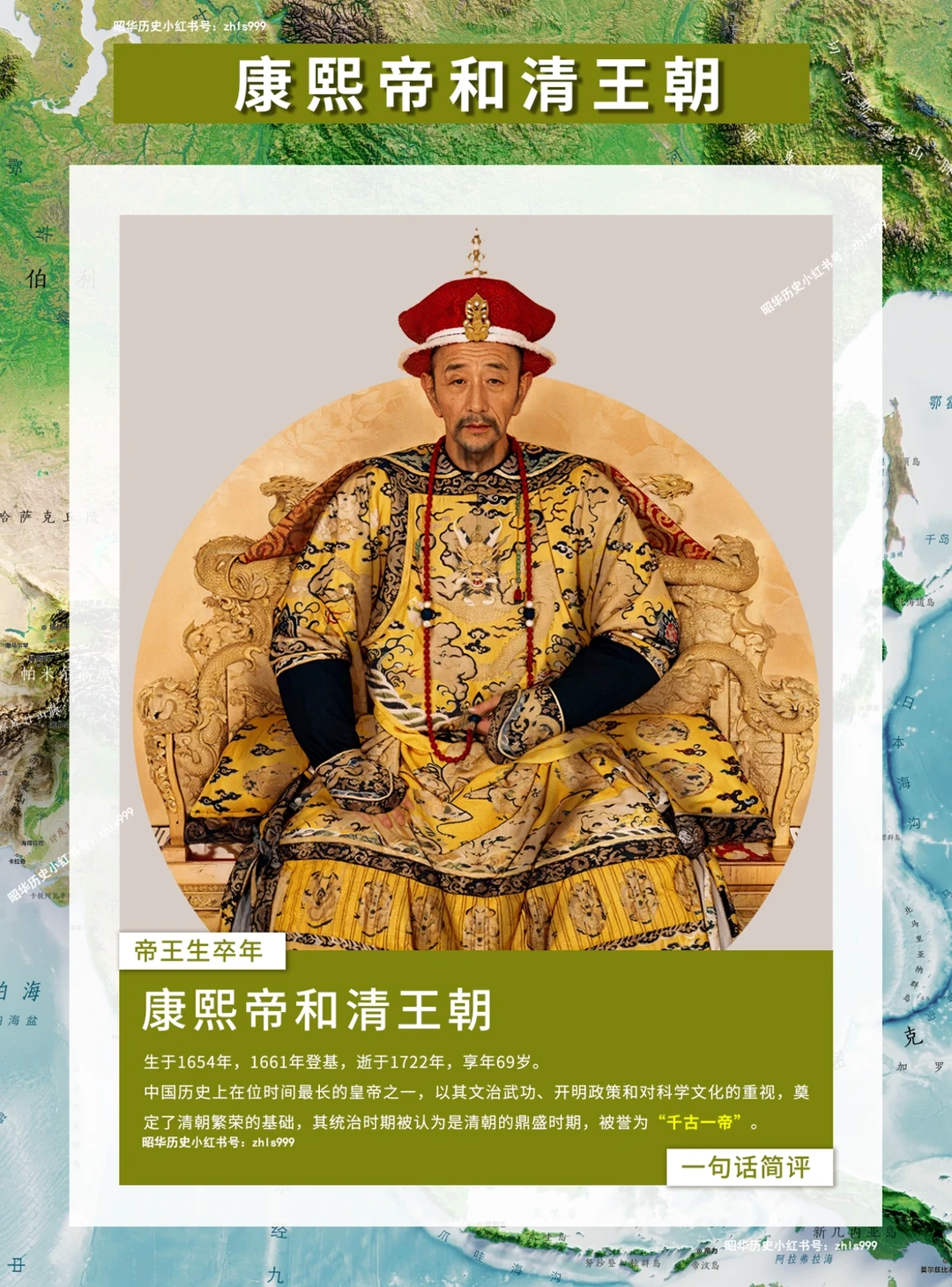 康熙生于1654年,1661年登基,逝于1722年,享年69岁。是中国历史上在位时间最长的皇帝之一,以其文治武功、开明政策和对科学文化的重视,奠定了清朝繁荣的基础,其统治时期被认为是清朝的鼎盛时期,被誉为“千古一帝”。