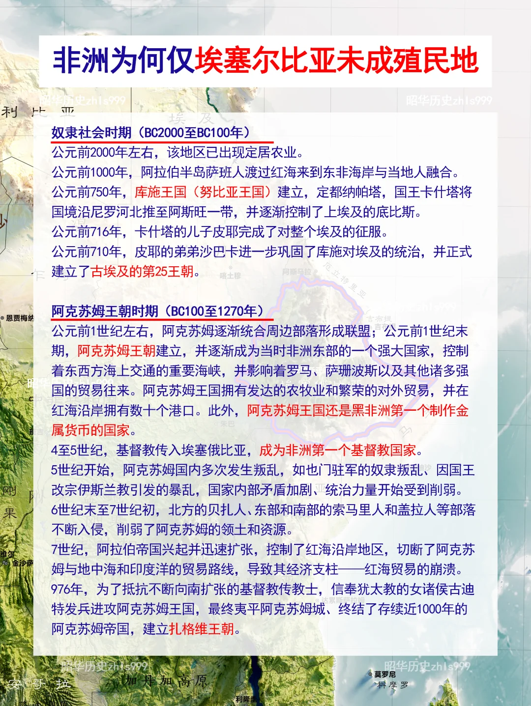 公元前1世纪末期,阿克苏姆王朝建立,成为当时非洲东部的一个强大国家,控制着东西方海上交通重要海峡,并影响着罗马、萨珊波斯以及其他诸多强国的贸易往来。阿克苏姆王国拥有发达的农牧业和繁荣的对外贸易,并在红海沿岸拥有数十个港口,是黑非洲第一个制作金属货币的国家。