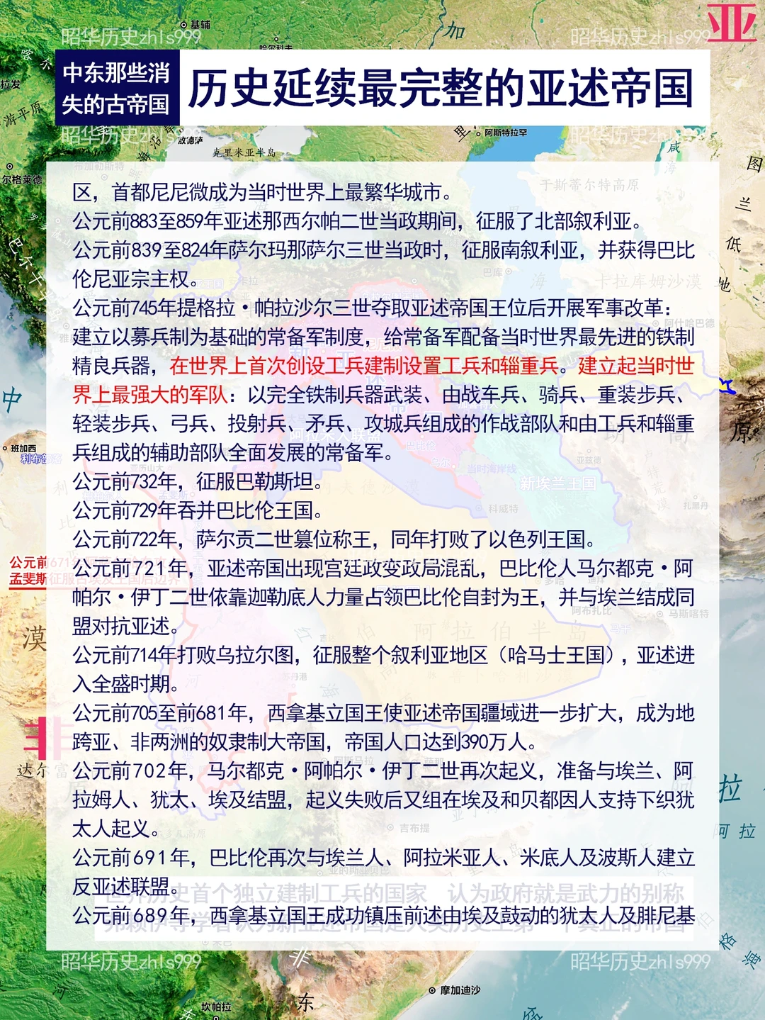 进入铁器时代,是亚述帝国鼎盛时期,军事力量与领土版图达到顶峰,征服了小亚细亚东部、叙利亚、腓尼基、巴勒斯坦、巴比伦尼亚和埃及等地区,首都尼尼微成为当时世界上最繁华城市。