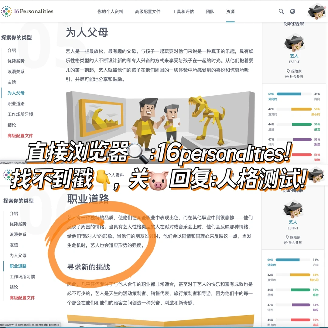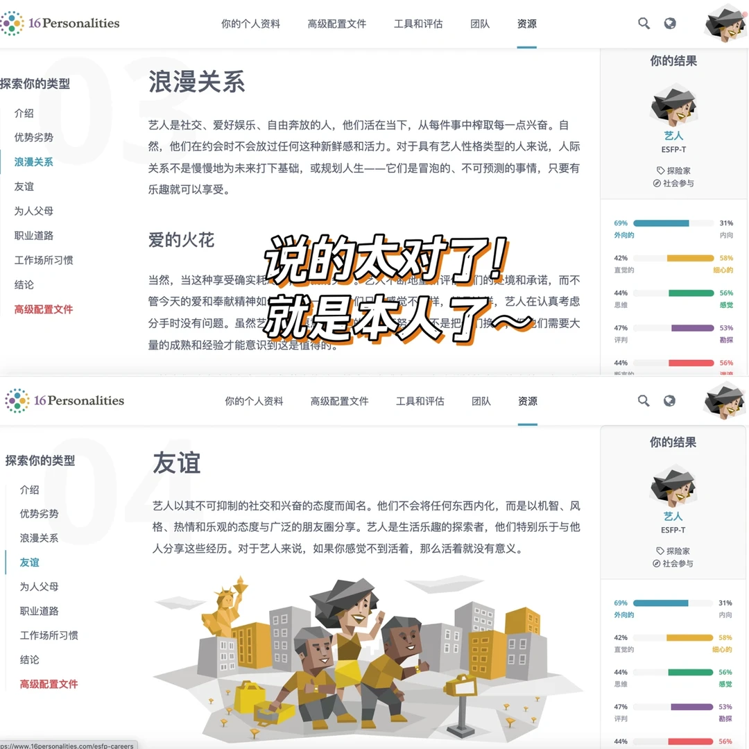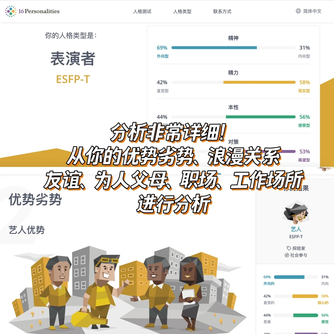 ❤️网页:16personalities ❤️设备:苹果安卓都🉑️ 🌟一款免费的人格测试! 🌟报告很详细,也超级准! 🌟从你的性格、友谊、爱情、工作、为人父母等等分析 🌟非常全面! 🌟我是表演型人格!爱交朋友爱玩!是我没错了