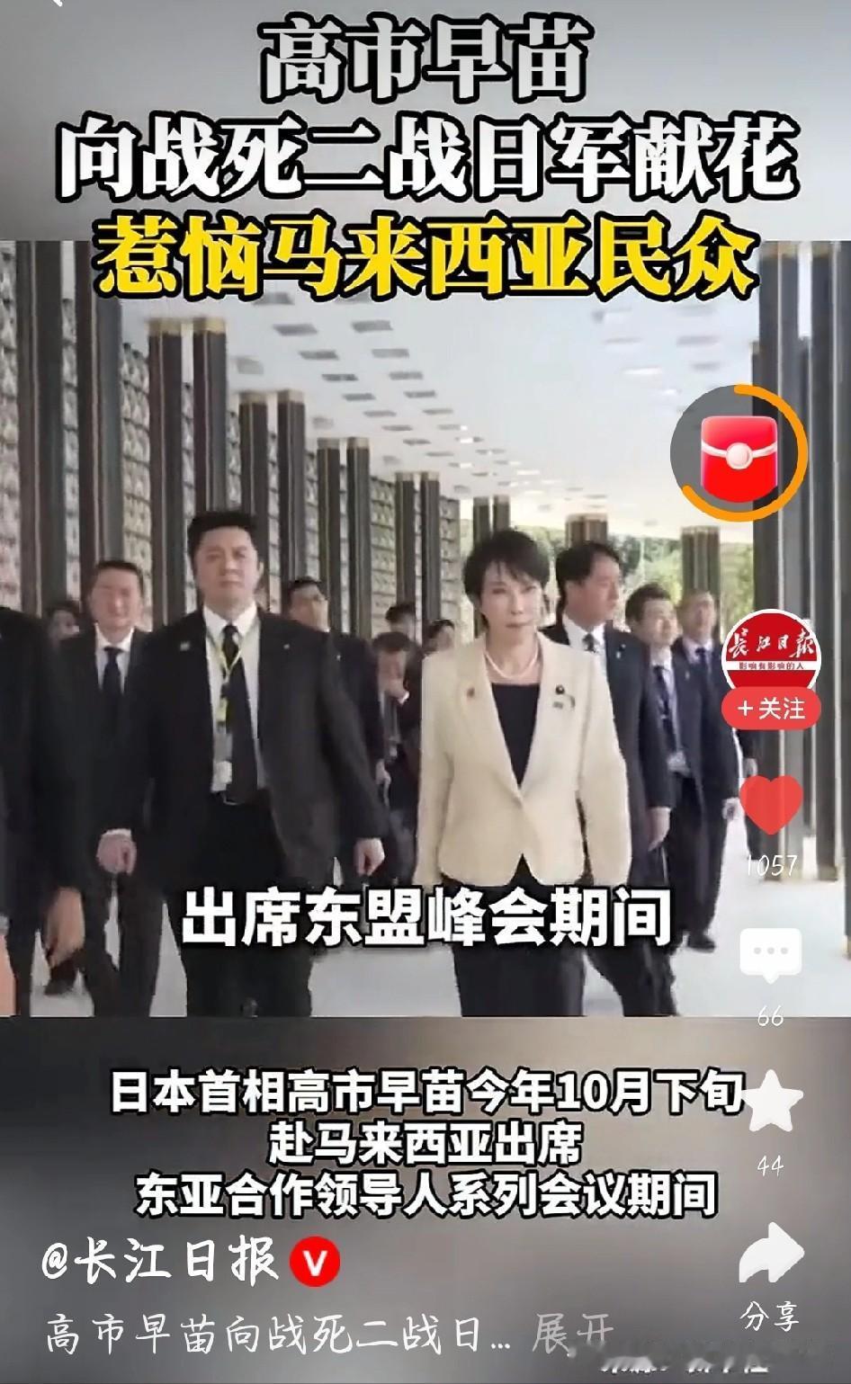 日本首相高市早苗也太离谱了!去马来西亚开会,居然专门给二战时侵略当地的日军“慰灵碑”献花,还只说“回顾历史”,半个字不提日军当年的暴行。 这操作直接惹毛了大马民众和学者!当年日军侵略马来西亚,烧杀抢掠的账还没算,现在她反倒给侵略者致敬,这不就是往受害者心上捅刀子吗? 说白了就是想美化侵略历史,搞历史修正主义。之前她还参拜过供奉甲级战犯的靖国神社,一直想篡改二战历史。 历史哪能随便改?无数人死于日军暴行,他们的后代还在呢!这种无视历史、伤害受害者情感的做法,不仅大马民众不答应,全世界爱好和平的人都看不过去。想洗白侵略者,门儿都没有!高市早苗下台 美化日本侵略者?高市惹恼大马民众 高市早苗 高市早苗演技派 图片截图于网络