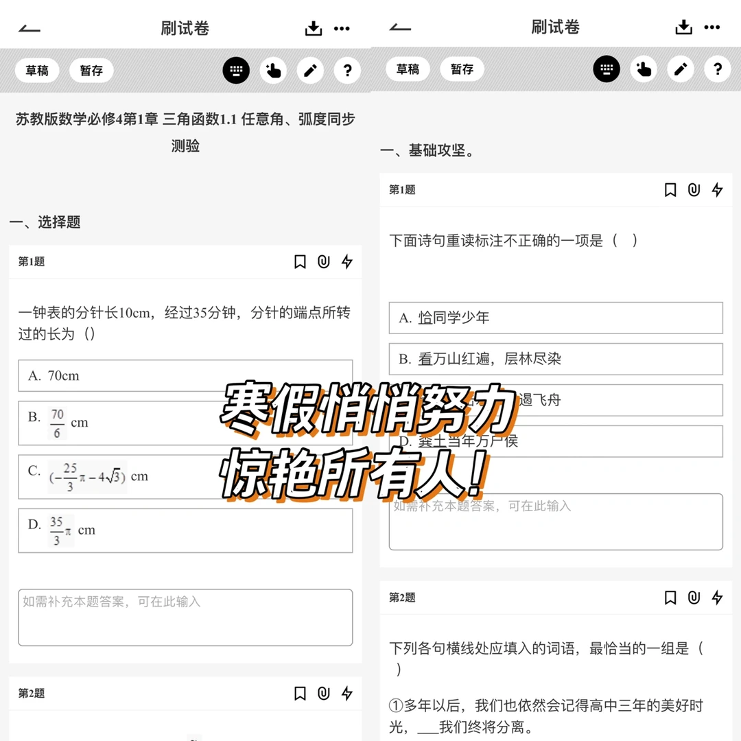 ❤️APP:疯狂刷题 ❤️设备:🍎安卓都🉑️ 🌟一款完全免费的刷题神器!真的超级好用 🌟题库超全!小学到大学、研究生,各个科目各个版本的真题都有! 🌟还有各种大神笔记分享和重难点总结!yyds 🌟英语听力还有草稿功能!支持创建错题本 - ❤️寒假来啦!试卷快刷起来!悄悄逆袭,学渣变学霸!