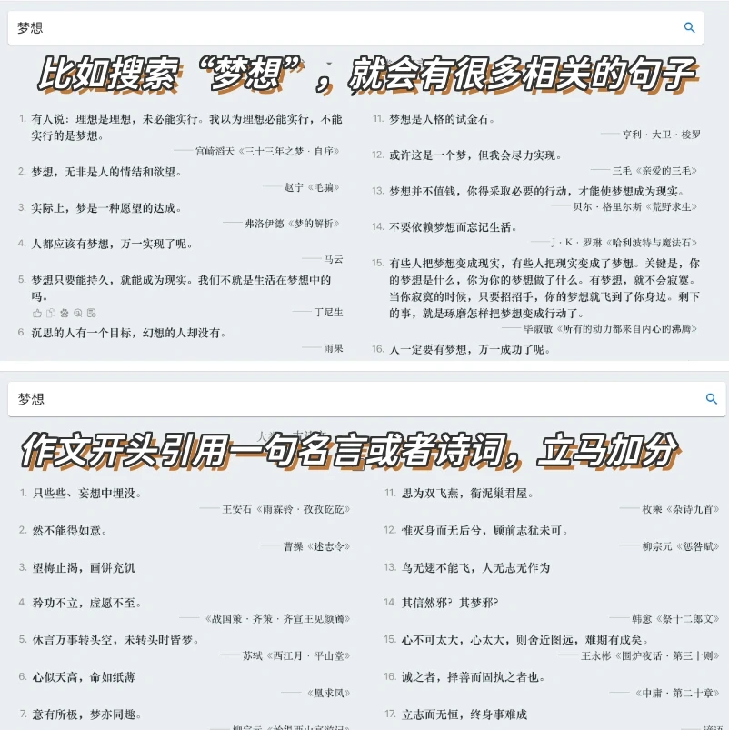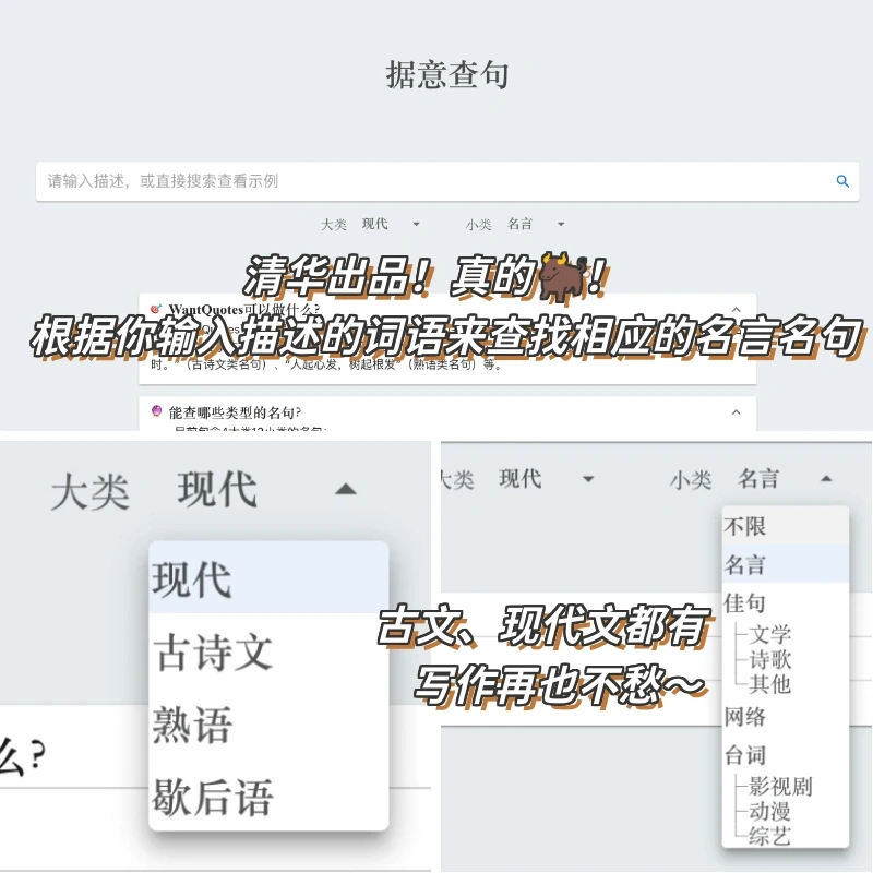 ❤️网站:wantquotes 🌟之前介绍过清华出品的一个网站“wantwords” 🌟处理语言yyds!反向词典用来降重超实用 🌟今天推的是通过描述,为你生出超多古文或者现代文相关的句子!帮你的作文润色! 🌟用在作文的开头结尾,以及文中的引用,作文瞬间高分!学生党冲啊