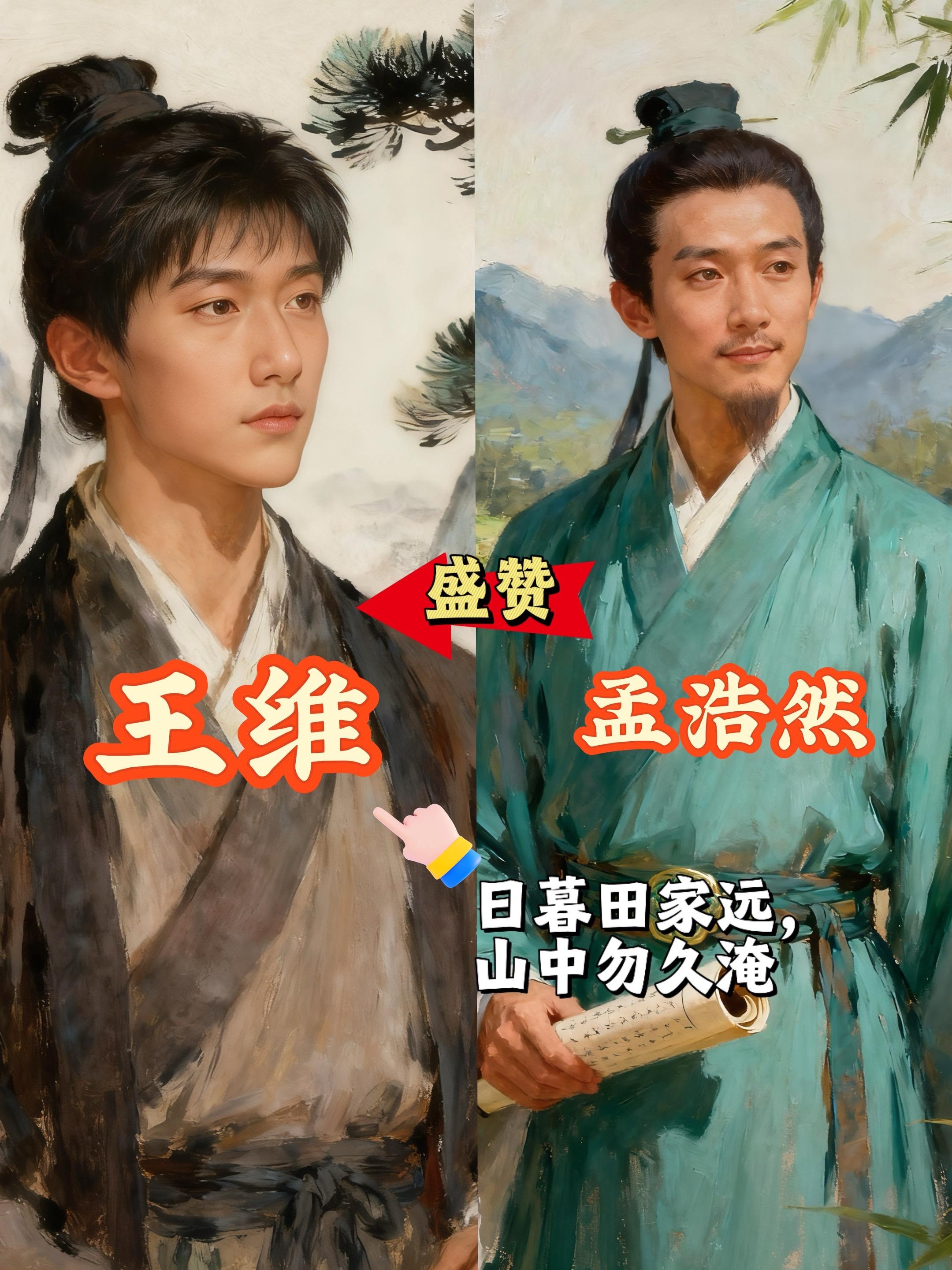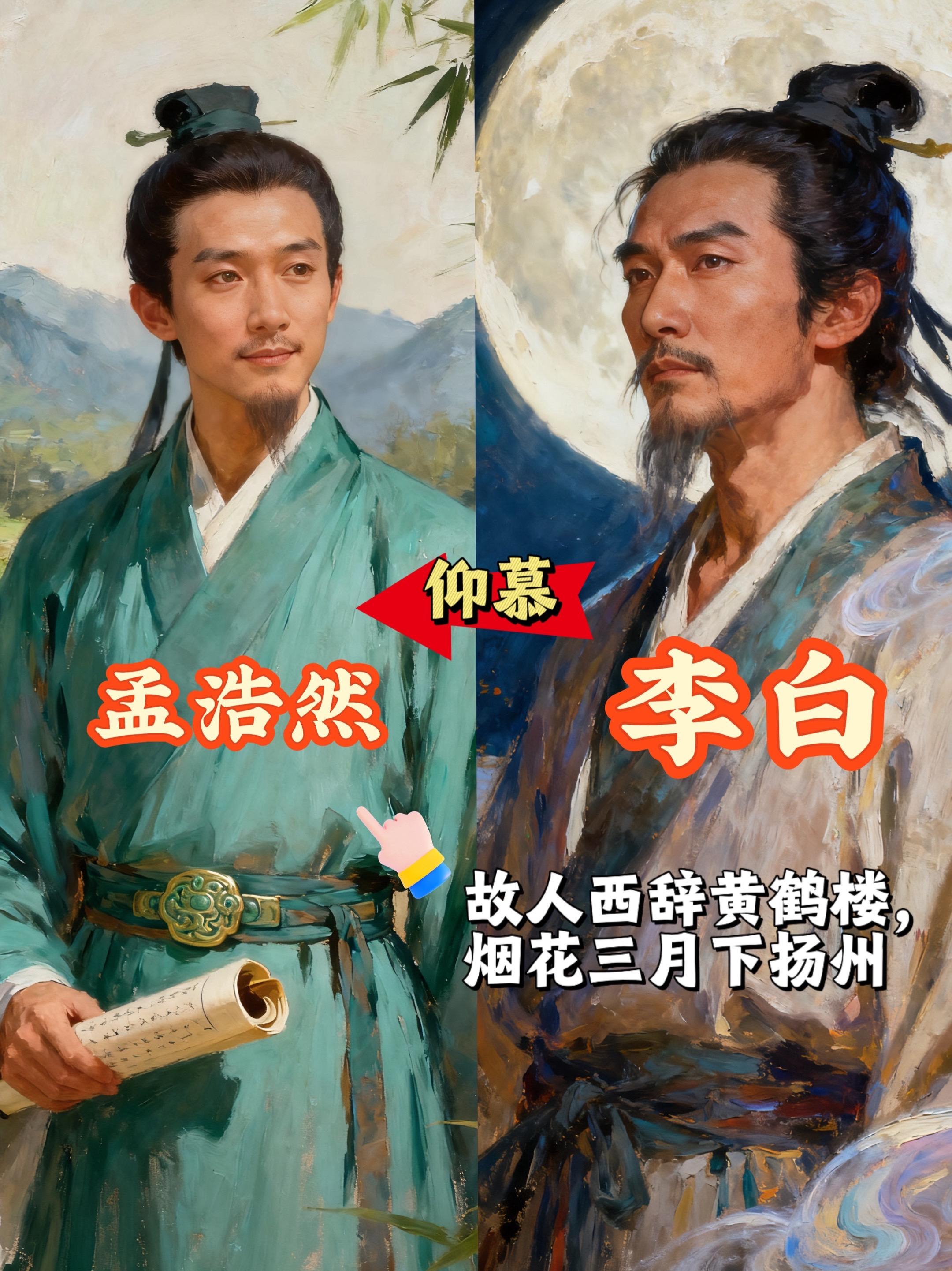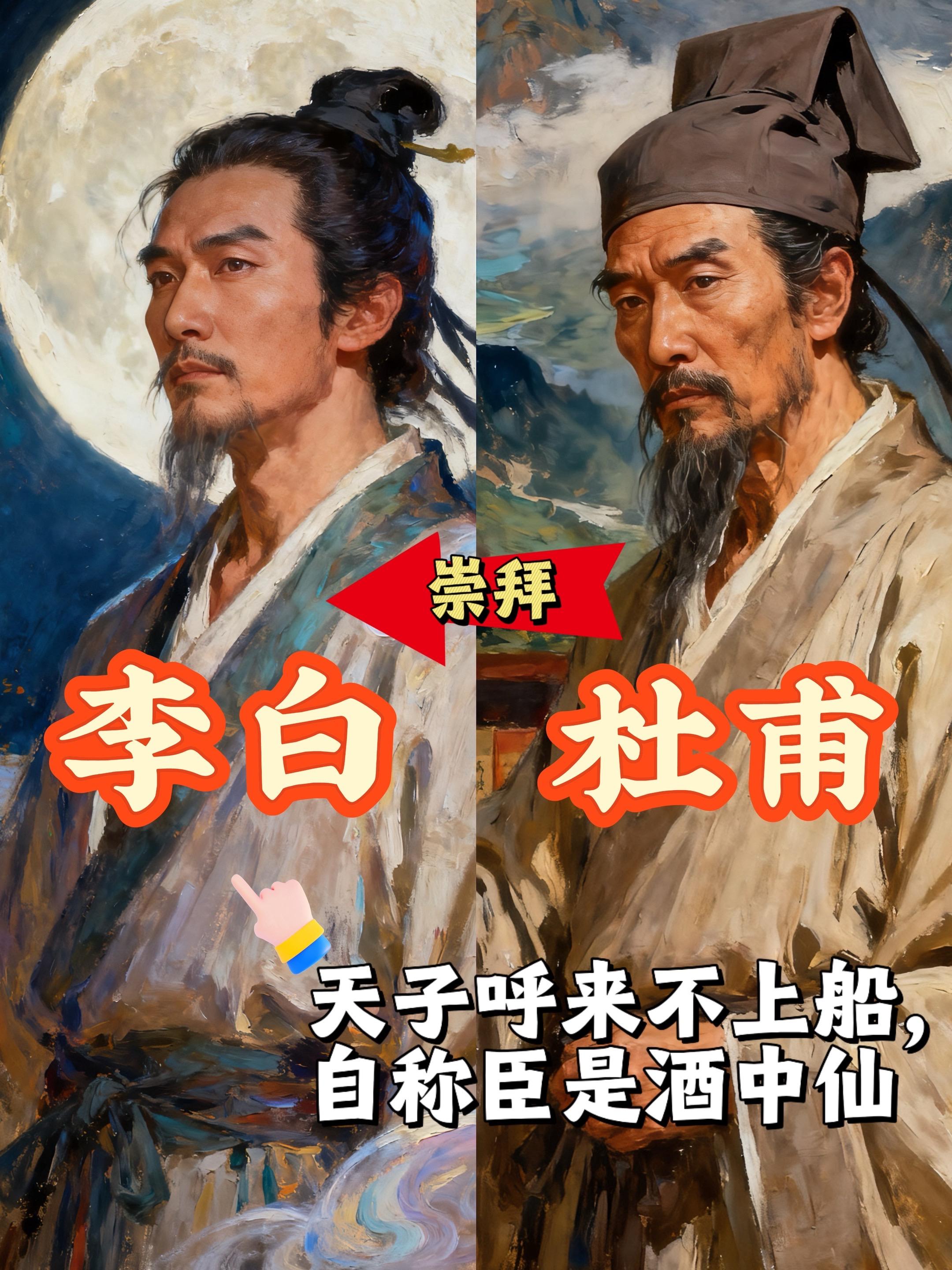 杜甫崇拜李白,李白仰慕孟浩然,孟浩然……李白 杜甫 孟浩然 王维 盛唐诗坛的知己长卷: 他们以诗为桥,以心为契,在千年的时光里,留下了一段彼此牵念、相互推崇的知己佳话。 杜甫对李白的崇拜,是刻进骨子里的仰望。长安酒肆的初见,让他从此记挂着那位“天子呼来不上船,自称臣是酒中仙”的谪仙人。李白的豪放飘逸、诗酒风流,成了杜甫心中最炽热的光。离别后,他屡屡提笔,在《赠李白》中直抒胸臆:“何时一樽酒,重与细论文”,字里行间满是对重逢论诗的殷切期盼,这份崇拜,纯粹而热烈,跨越了岁月与距离。 而李白心中,
