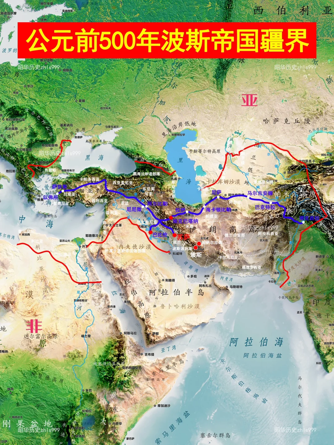 [三R]丝绸之路西段主干道:从巴比伦出发,穿越伊朗高原,经过欧皮斯、贝希斯敦悬崖等地,最终到达印度河流域的塔克西拉。这条道路在后世被称为呼罗珊大道。