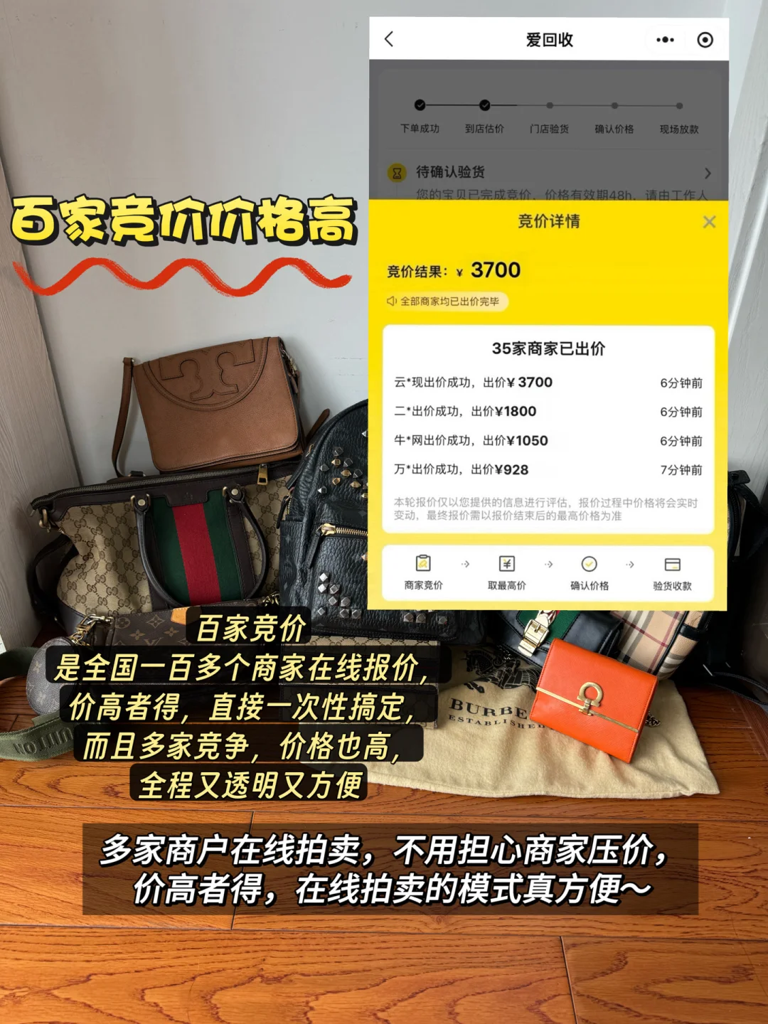 而且可以把闲置的包包、手表或者数码产品在平台上直接预估价,百家门店会以拍卖的形式在线竞拍,价格只会越拍越高,把利给到顾客。