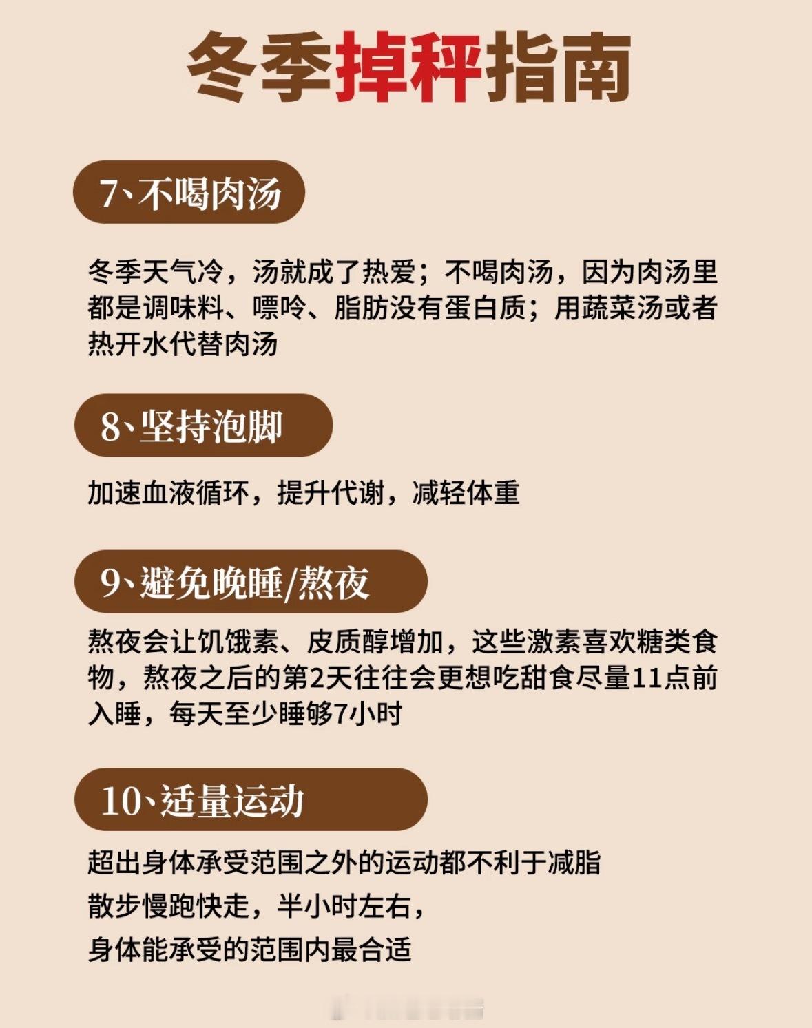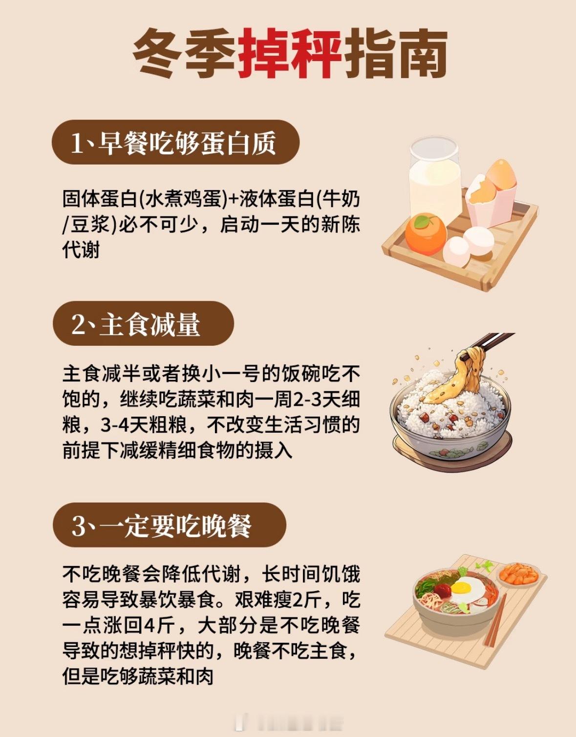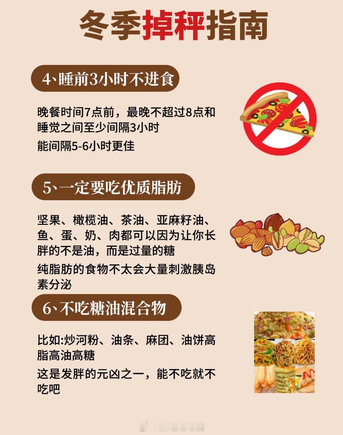 冬天想掉秤减脂?这10招太管用了!主食减半或换粗粮,晚餐别省,吃肉吃菜就行!睡前3小时别吃东西,忍住!优质脂肪每天来点,坚果、鱼油安排上。远离糖油混合物,不然真的白练少喝肉汤,多泡脚,早点睡,代谢好。