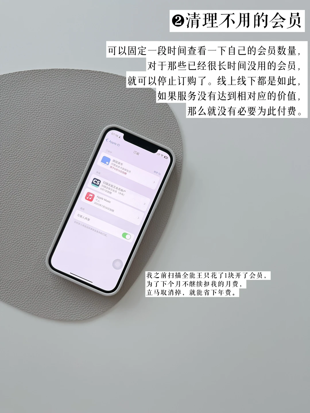 经常查看自己的会员数量,已经很长时间没用的会员,马上停止订。服务没有达到相对应的价值,就没有必要为此付费。比如我之前扫描全能王只花了1块开了会员,为了下个月不继续扣我的月费,立马取消掉,就能省下年费。