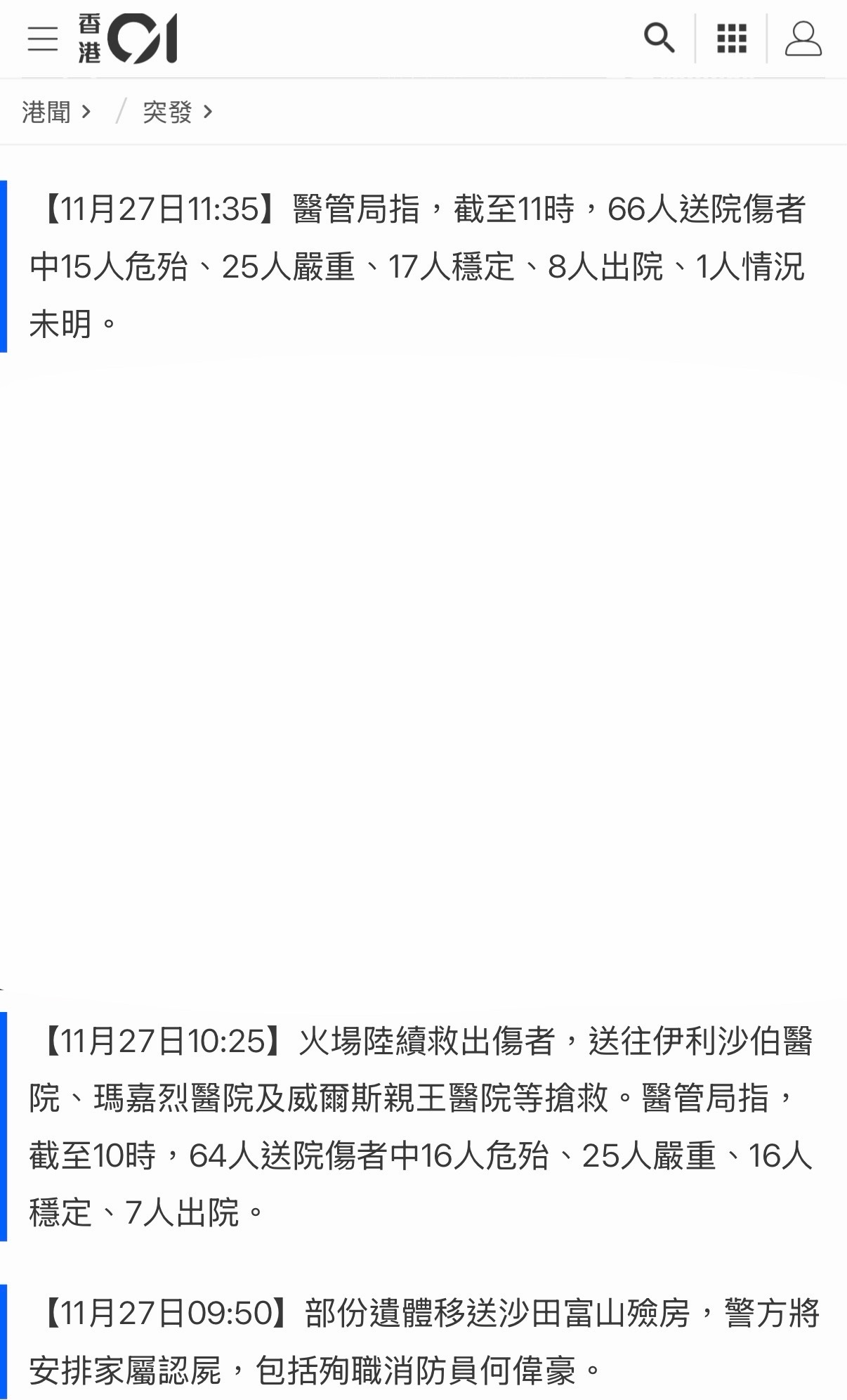 🔻分享的图片显示,还有一些生还者陆续被救出。🔻hk01报道:“火場陸續救出傷者,送往伊利沙伯醫院、瑪嘉烈醫院及威爾斯親王醫院等搶救。醫管局指,截至11時,66人送院傷者中15人危殆、25人嚴重、17人穩定、8人出院、1人情況未明。”香港火灾3座大厦火势仍在扑灭中香港火灾已致44人遇难热点现场