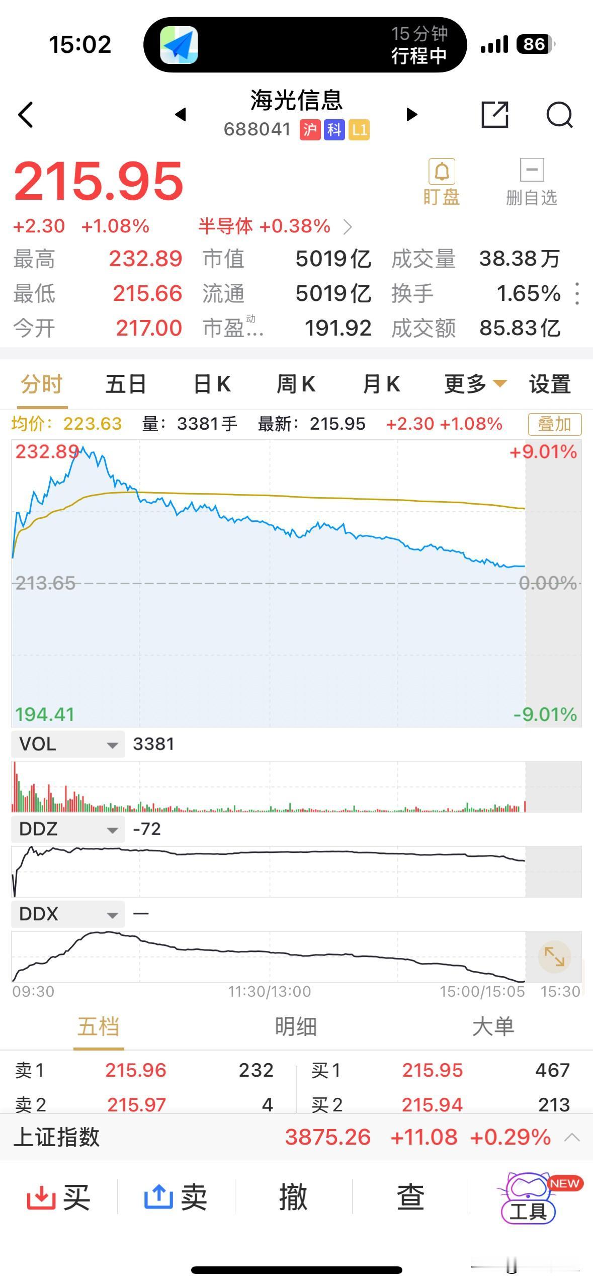 海光信息全天冲高回落,盘中最高232元,收215.95元,涨幅1%,全天振幅达8%,K线图上收绿线,估计明天至少也会是如此振幅,但大概率却是向下考验200.0元整数关口。 今天追高而进的股友,明天要注意风险管理。 海光信息即使吸并中科曙光在近期落地,短期内股价也难以为继。 原因无非是获利盘在涌现,承接的资金不足。 近200倍市盈率的个股,其实散户朋友们看看就好。 庆幸自己在中科曙光近乎翻倍时(117元)已经出局。 乐呀财经