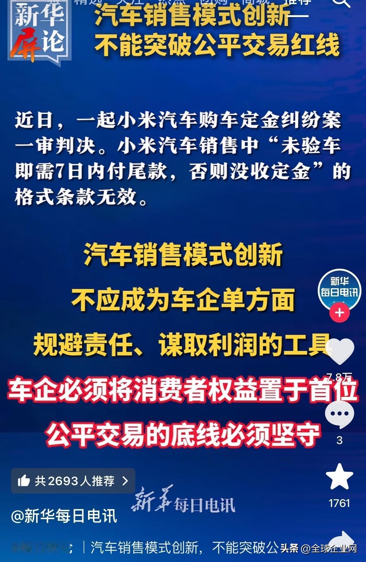新华社是一点面子不给雷军,直接指名道姓了!销售模式不应成为车企单方面逃避责任、谋取利润的工具!