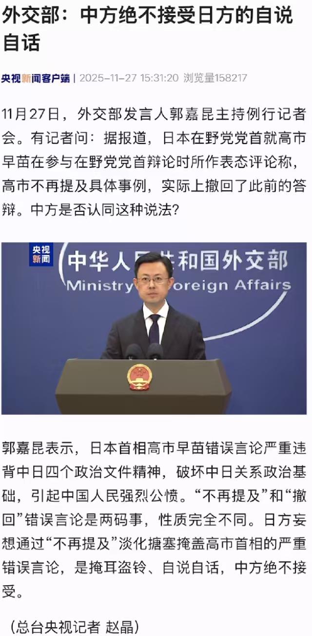 高市早苗绝对没有那么简单,她绝对是日本右翼势力的代表人物! 在昨天的日本议会的答讯中,高市早苗称以后不再提及相关事例,但是并没有撤回之前的荒谬涉台言论。有人认为这其实是撤回了,但是并没有,你要知道,她其实就是在模糊化台湾的地位,她不引用『波兹坦公告』和『开罗宣言』这些战后秩序的文件,而是拿什么并不被承认的『旧金山合约』来说事。 今天外交部的发言人也公开表示,不接受高市早苗的说法,“不提及”和“撤回”是两码事,性质完全不同。意思就是这件事情没完!! 今天亮哥在直播中透露,高市早苗在短短16个月的时间内,从2024年8月到2025年10月,5次“参拜”靖国神社,这种行为你想想,她怎么可能会认识到错误。她就是彻彻底底的极右翼军国主义分子。 所以我们在这件事情上,一定要追究到底,彻底打击掉它们的嚣张气焰。