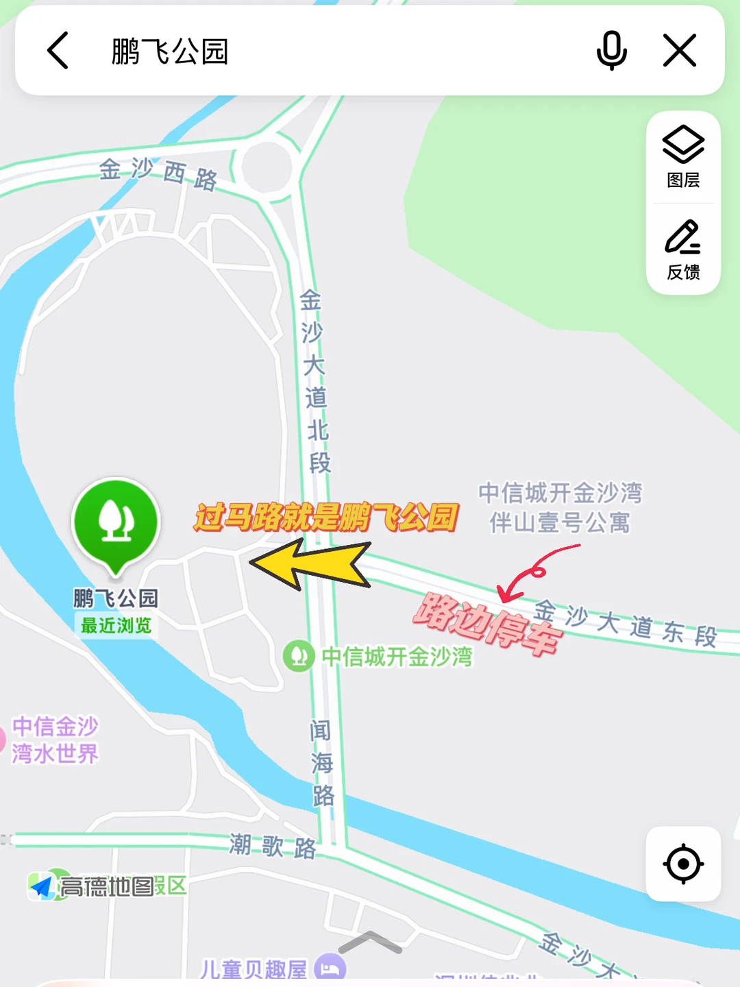 🅿️自驾可以把车停在金沙大道东段(图15的位置),亲测工作日是可以停的而且不花钱,过马路就是公园,或者可以停金沙湾停车场