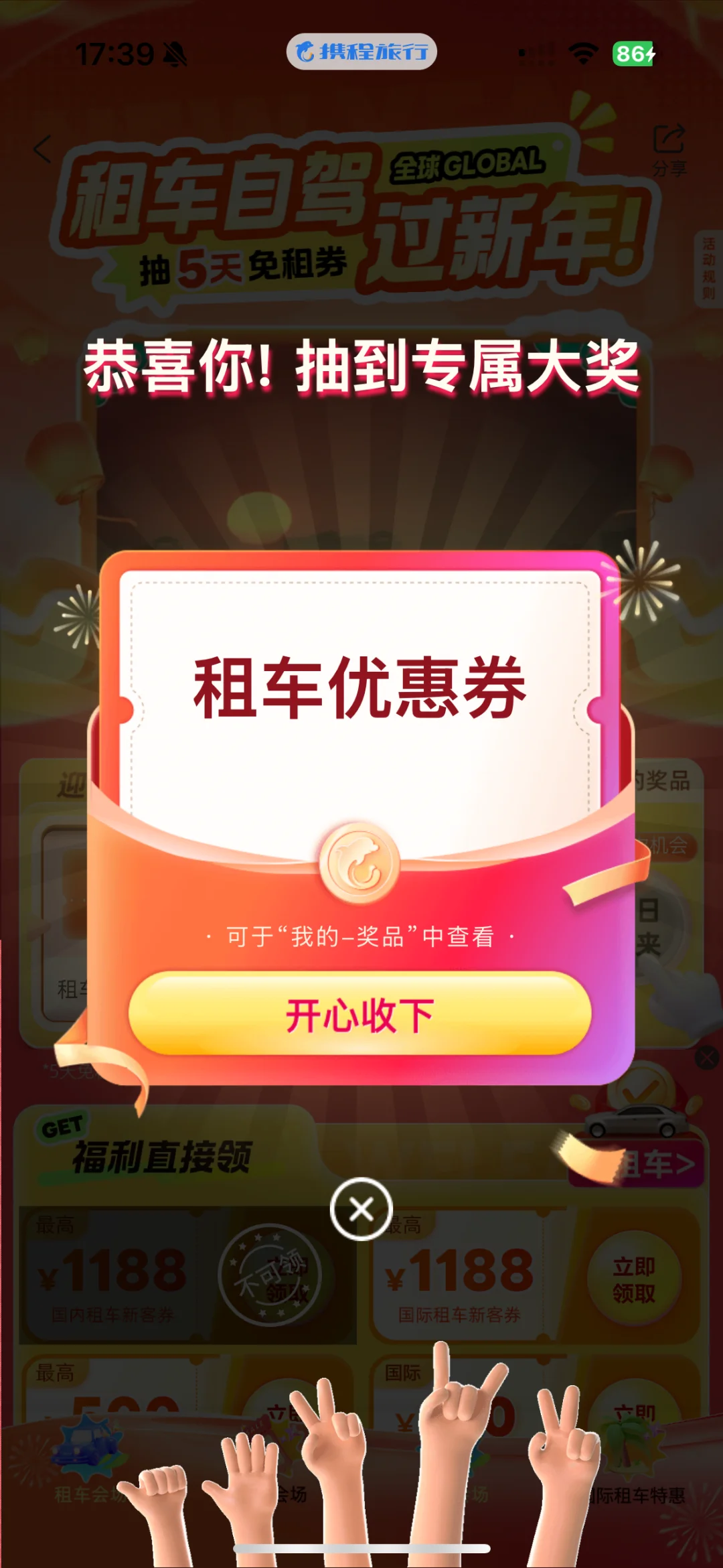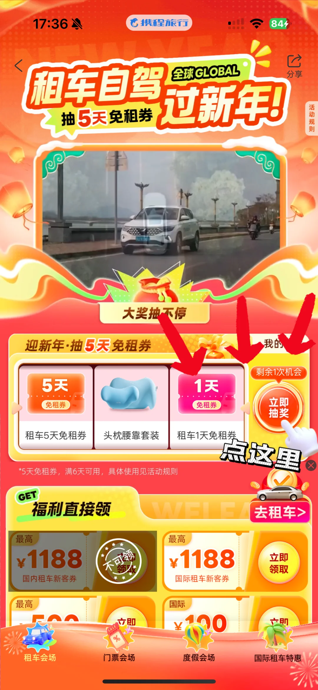 携程主页【zc123】,活动页面可以领无门槛租车满减券,还能参与抽奖!(详见图12、13、14)