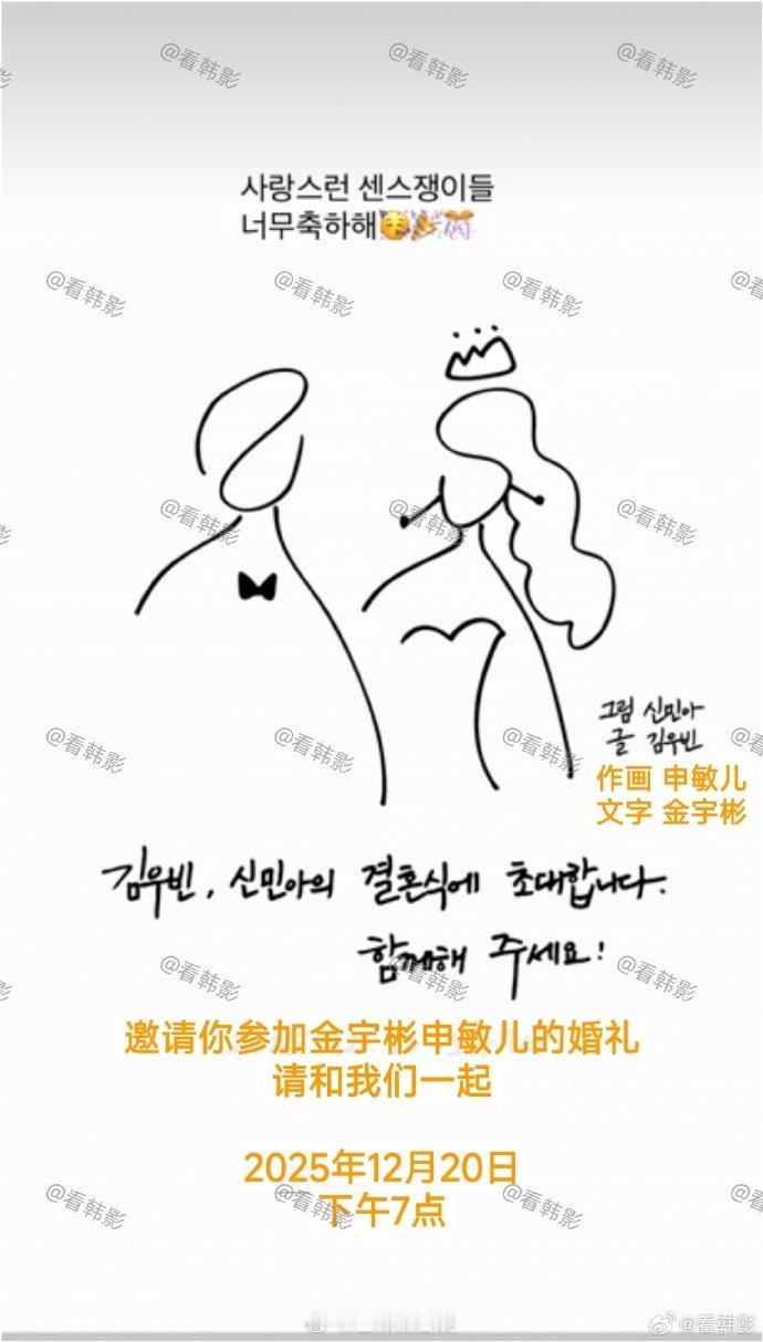 金宇彬申敏儿婚礼请帖 甜炸了!金宇彬申敏儿开始发放婚礼请帖,特别的是请帖由申敏儿作画、金宇彬书写,两人用各自擅长的方式共同制作,这份心意太甜蜜了!