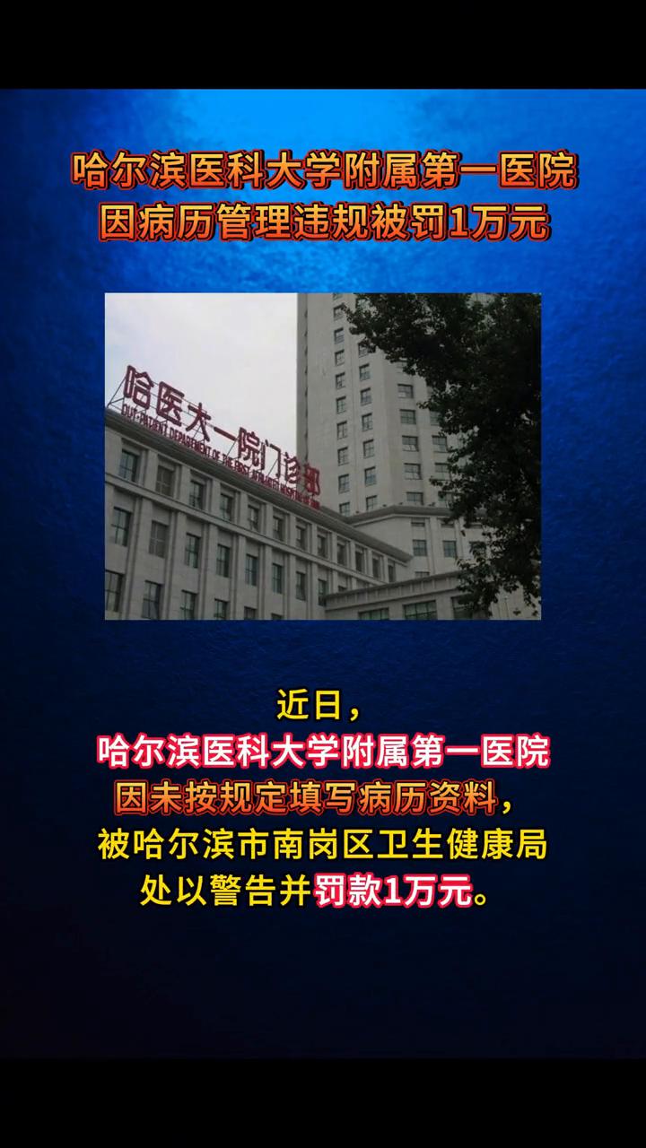 哈尔滨医科大学附属第一医院因病历管理违规被罚1万元。 近日,因未按规定填写病历资料,被哈尔滨市南岗区卫生健康局处以警告并罚款1万元。行政处罚决定书显示,哈尔滨医科大学附属第一医院存在未按规定填写病历资料的行为。 依据《医疗纠纷预防和处理条例》第四十七条第(四)项、《黑龙江省卫生健康行政处罚裁量基准(2023年版)》的规定,哈尔滨市南岗区卫生健康局对该院给予警告。