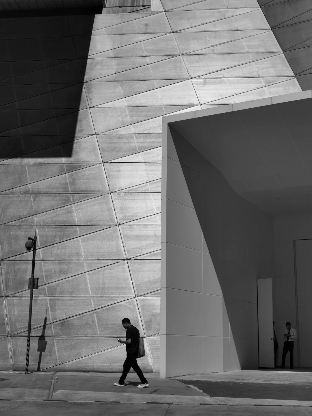 P4:早上 9 点拍摄于深圳当代规划馆。利用阳光投射在建筑上形成的几何线条与光影,恰逢展馆工作人员与前景行人入镜,选用 35mm 左右焦段抓拍,以 “景大人小” 的构图,让画面具有故事感。