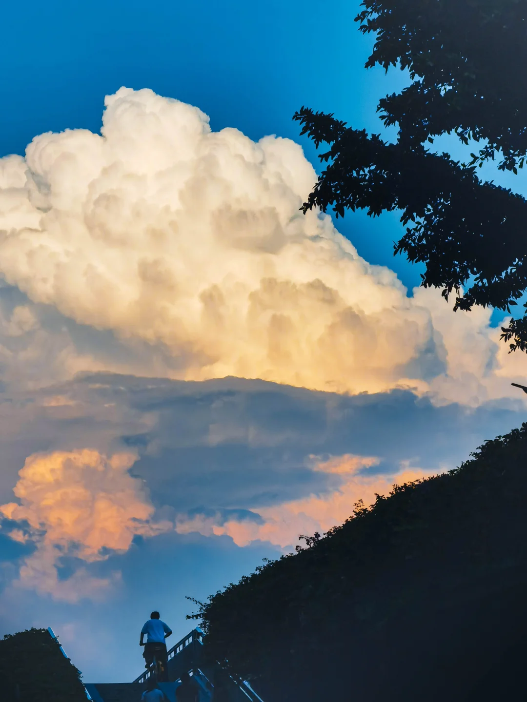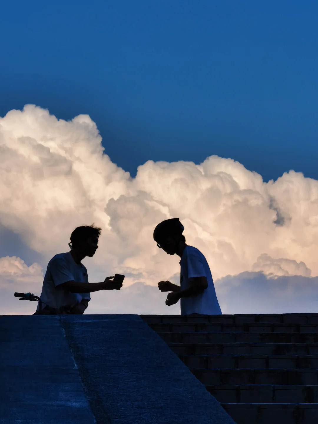 P6:下午 18 点的人行天桥,天空中形态舒展的云朵格外亮眼。拍摄时特意降低机位对准两位交谈的行人,同时下调手机曝光 ——保留了云彩的通透质感与细节,又让前景人物形成清晰剪影,让画面自然舒适。