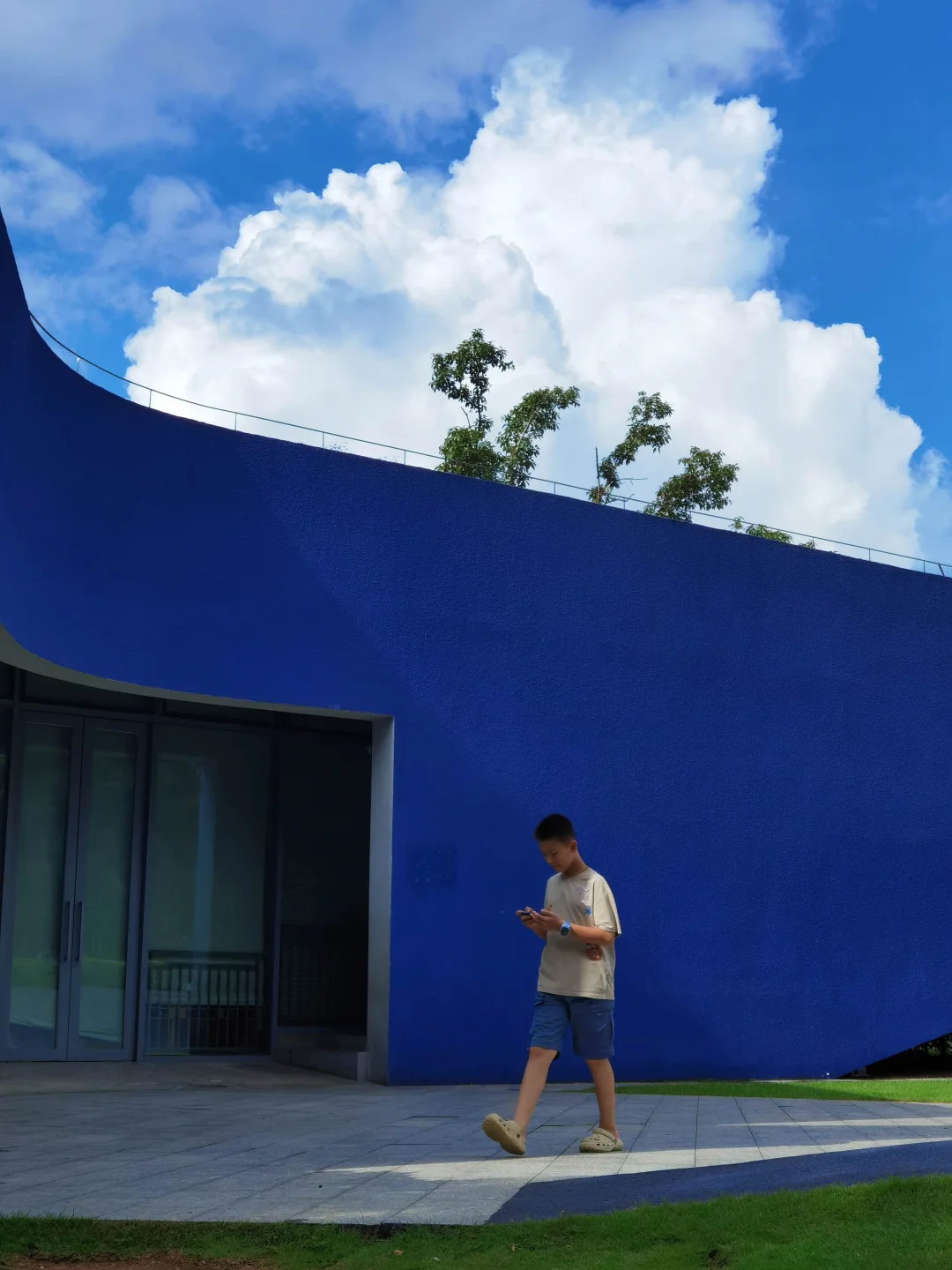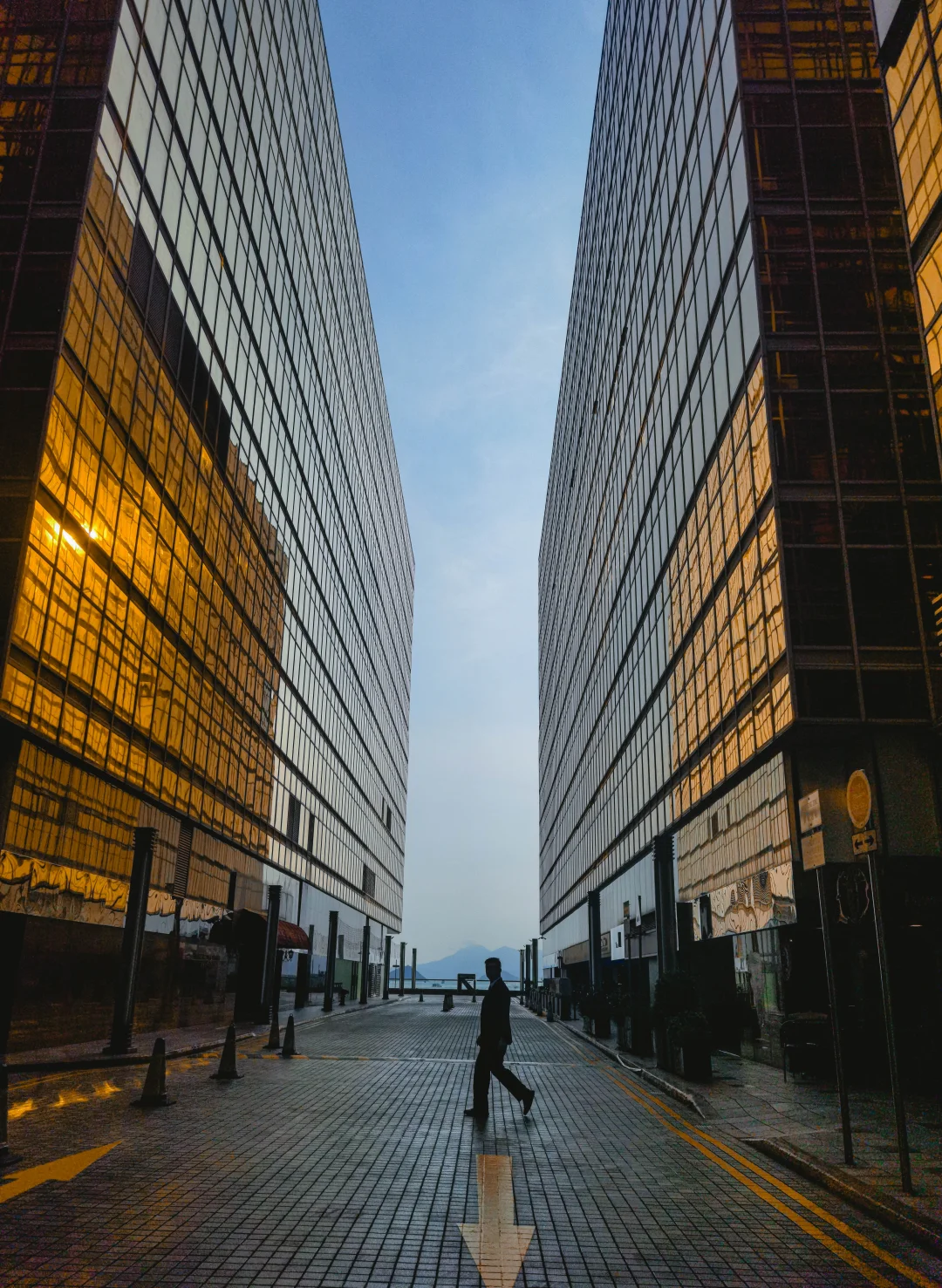 P8:两边的黄颜色的建筑玻璃墙,醒目突出,与蓝色的天空形成冷暖对比,视觉冲击力强。利用手机广角等待人物穿过画面中心时,捕捉动态,增强画面冲击力。