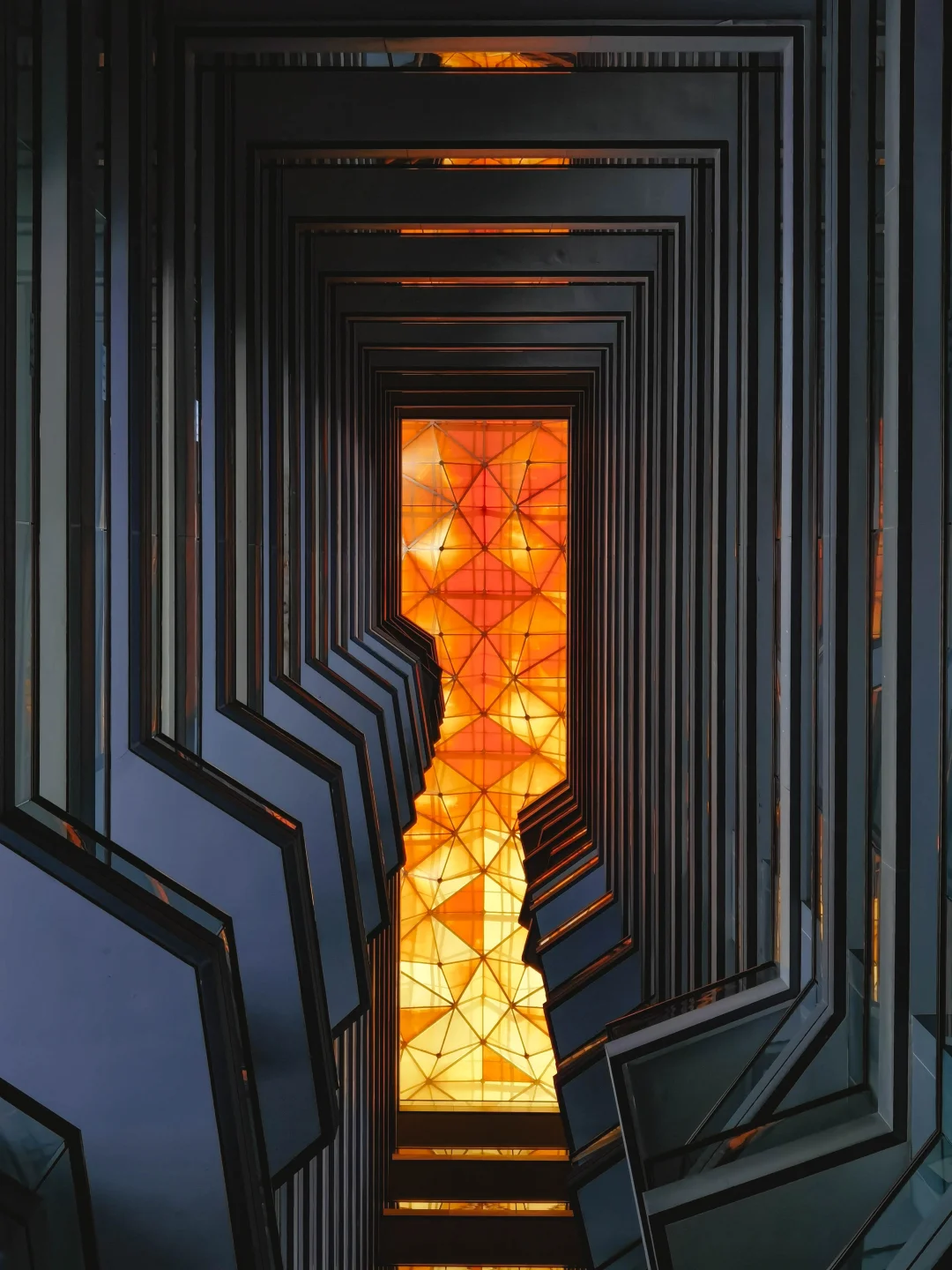 P2:酒店高楼层带来强烈空间透视感,顶部橙黄色灯饰暖调鲜明;拍摄时特意用广角镜头贴近地面仰拍,并将画面调整至左右对称,最终捕捉到兼具极简风格与视觉冲击力的画面。