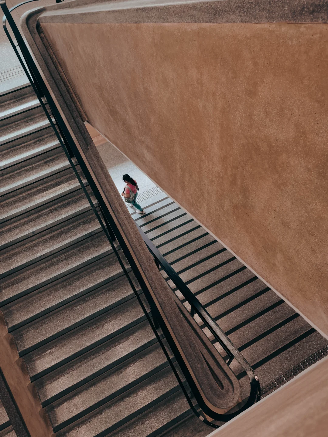 P18:拍摄于香港中环街市的台阶处,观察发现楼梯自然形成规整的三角形构图,极具几何美感。拍摄时守在原地等待,待人物主体走入三角形构图中心后立即按下快门,借由几何框架精准突出人物,让画面构图既工整又富有焦点。