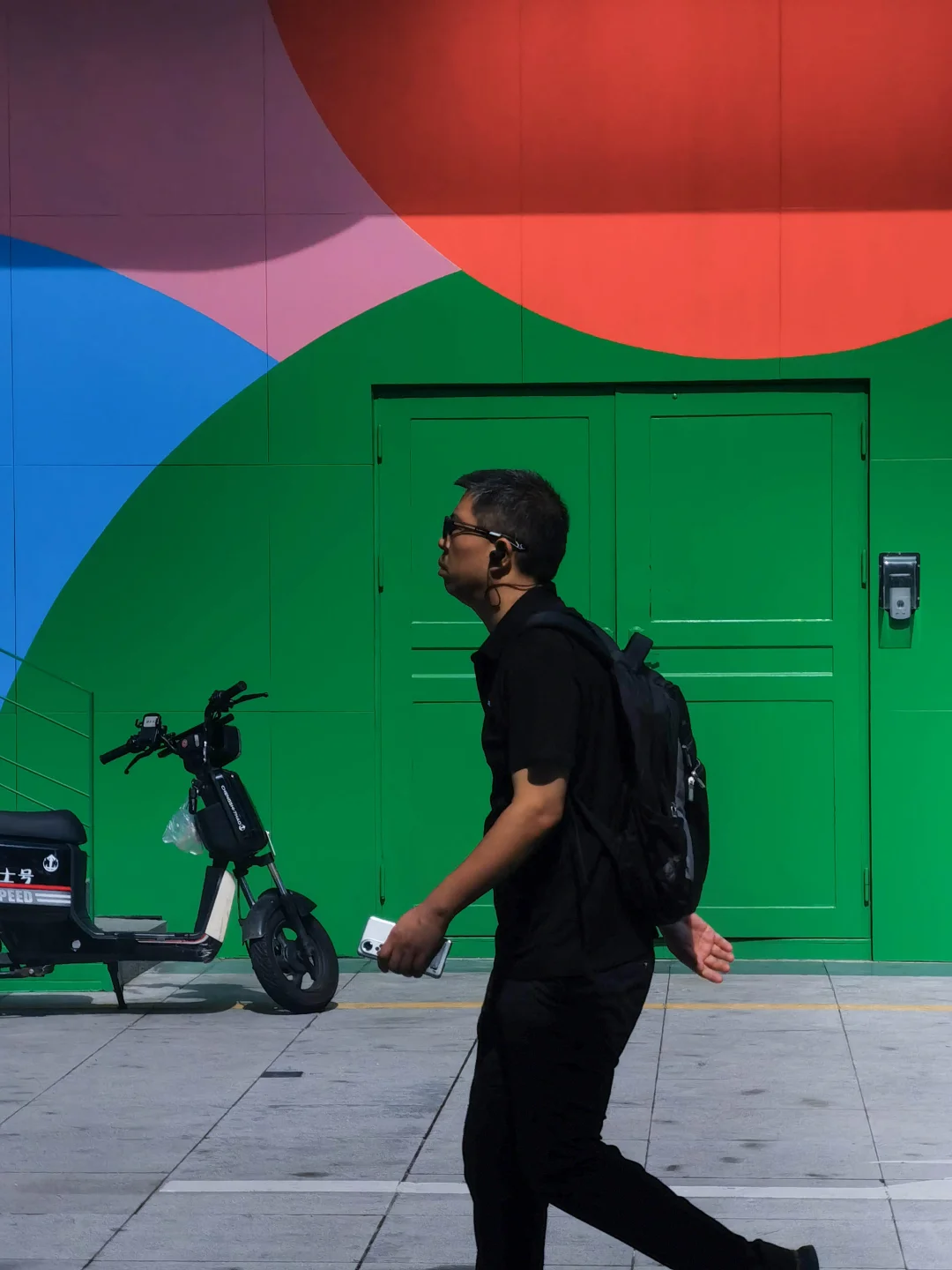 P15:早上 10 点左右,一面色彩饱和度极高的广告墙映入眼帘 —— 红、绿、蓝三色碰撞鲜明,本身就极具视觉张力。拍摄时耐心等待行人经过,捕捉行走动态,让人物与多彩墙面互动。