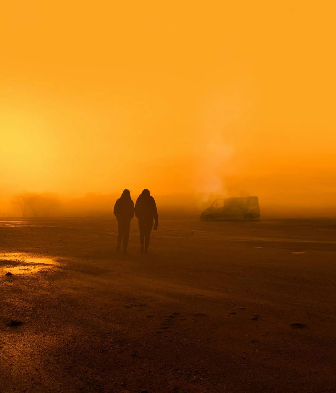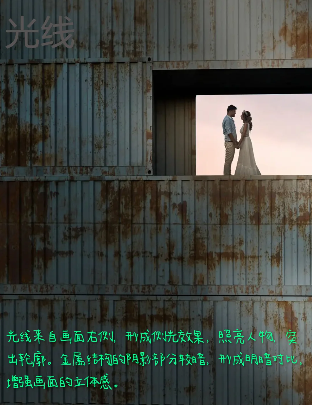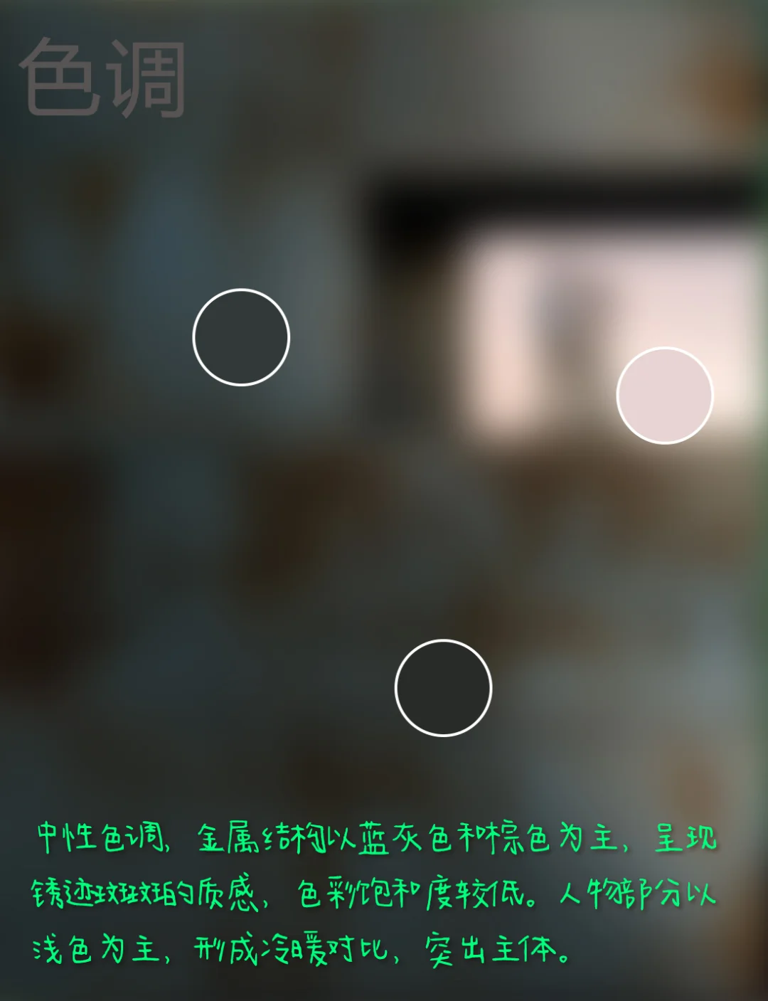 4.色彩:中性色调,金属结构以蓝灰色和棕色为主,呈现锈迹斑斑的质感,色彩饱和度较低。人物部分以浅色为主,形成冷暖对比,突出主体。