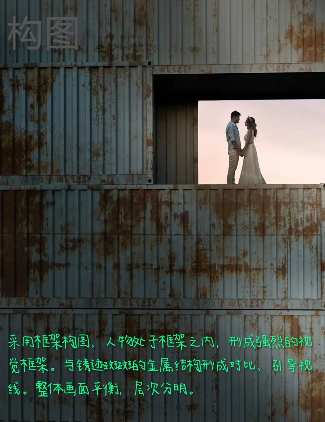 1.构图:采用框架构图,人物处于框架之内,形成强烈的视觉框架。与锈迹斑斑的金属结构形成对比,引导视线。整体画面平衡,层次分明。