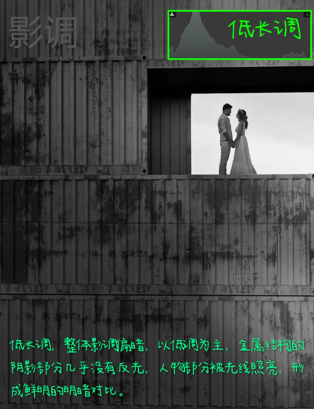 3.影调:低长调,整体影调偏暗,以低调为主,金属结构的阴影部分几乎没有反光,人物部分被光线照亮,形成鲜明的明暗对比。