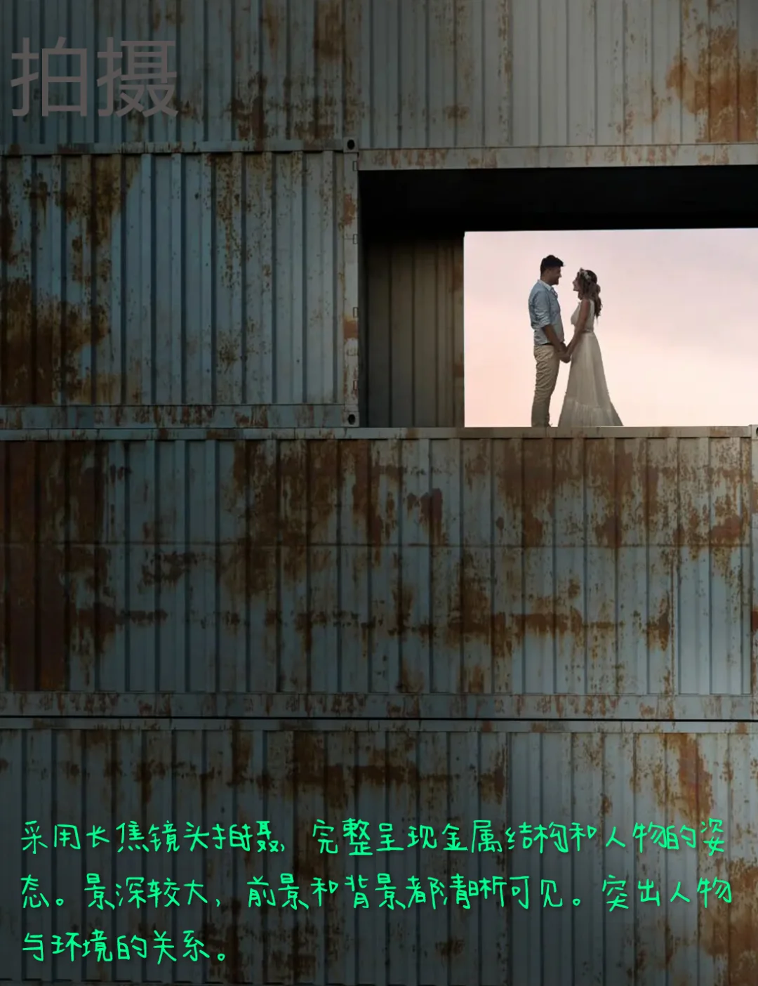 5.拍摄:采用长焦镜头拍摄,完整呈现金属结构和人物的姿态。景深较大,前景和背景都清晰可见。突出人物与环境的关系。