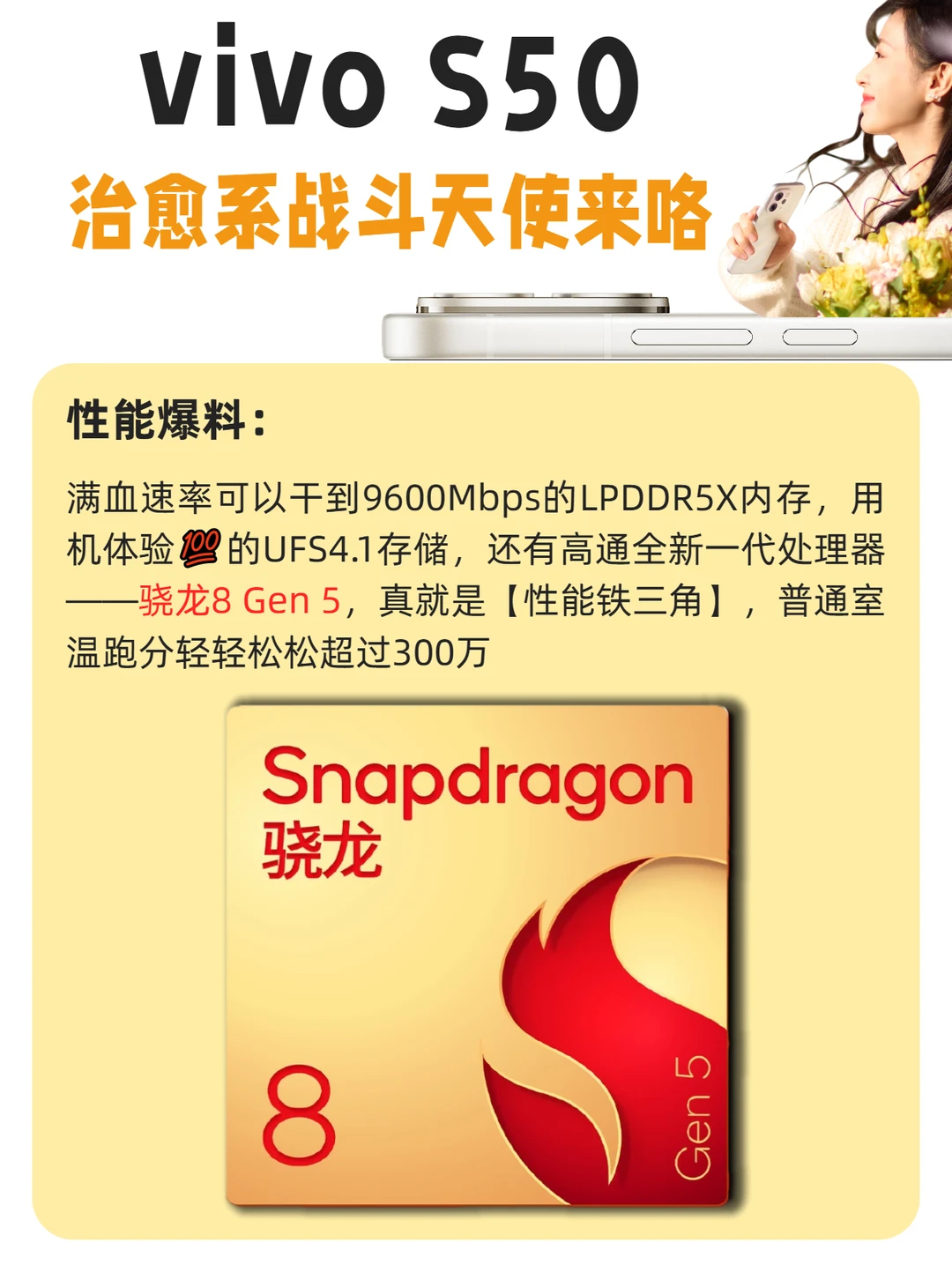 满血LPDDR5X内存,速率可以干到9600Mbps的,用机体验💯的UFS4.1存储,还有高通旗舰级处理器——骁龙8 Gen 5,真就是【性能铁三角】,普通室温跑分轻轻松松超过300万
