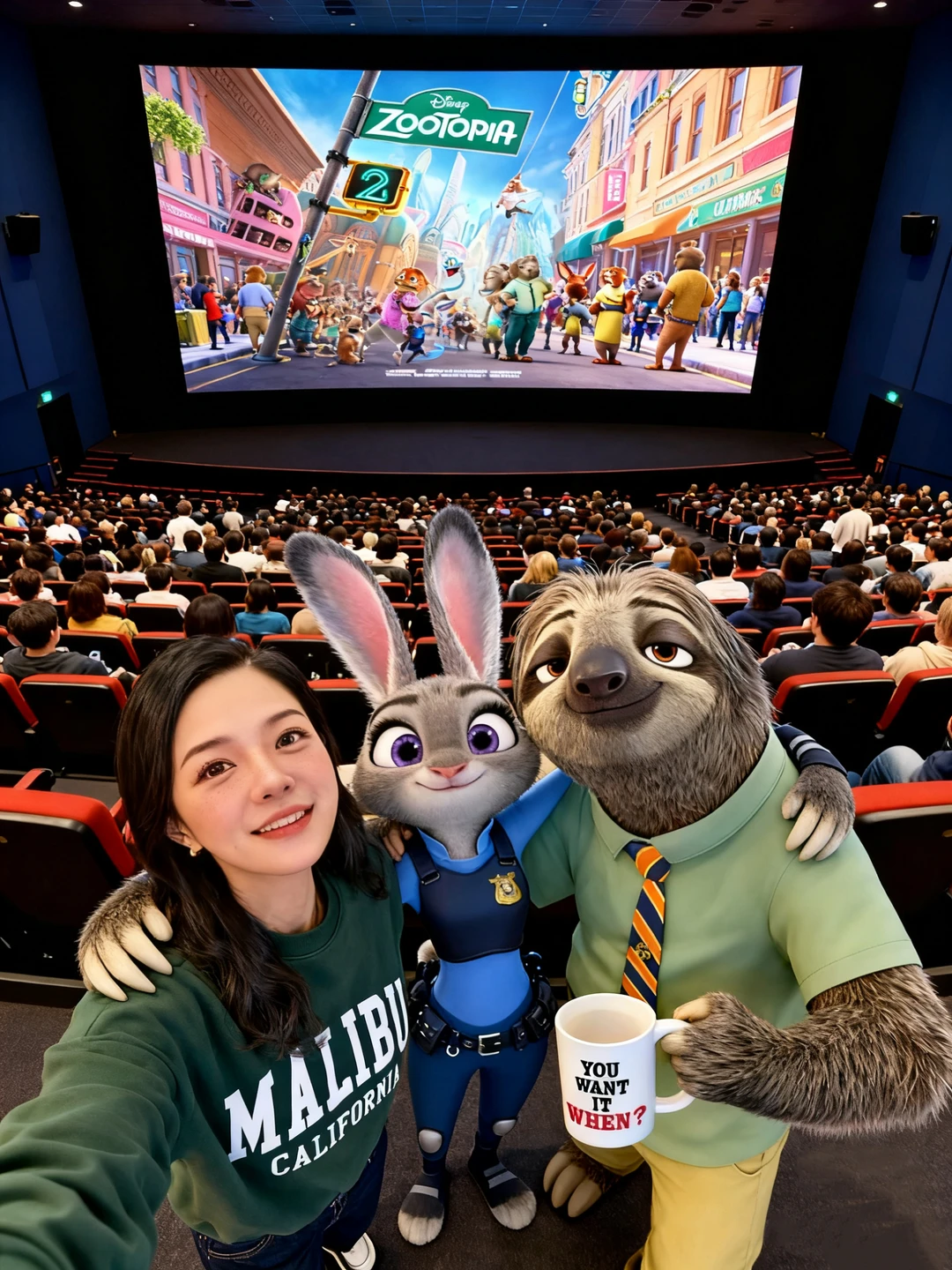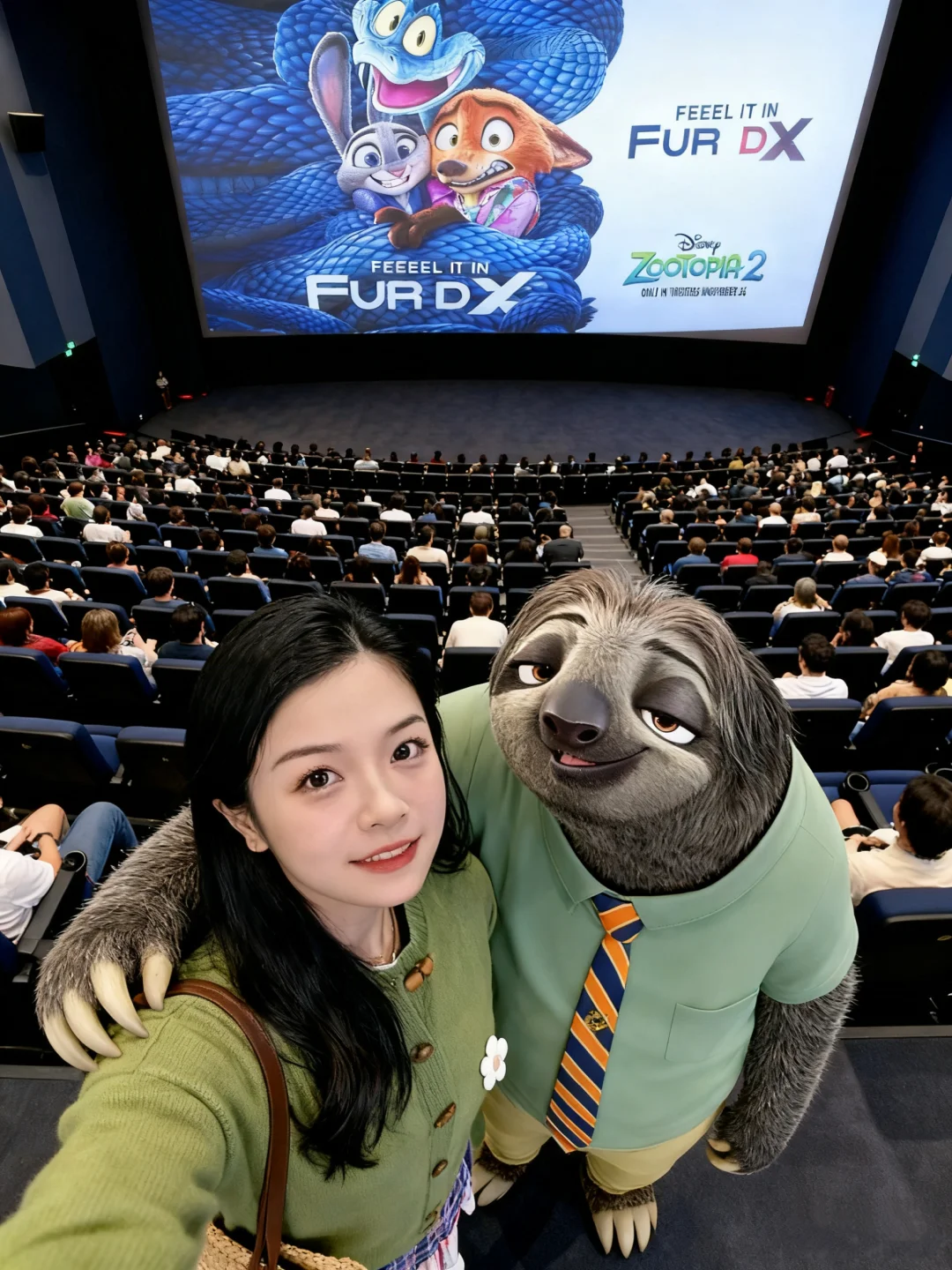 口令:不要换脸,人物脸部不能有任何改变。请将图1和图2图3融合成一张合影,俯拍自拍照,画面构图紧凑,三个主体靠得很近,勾肩搭背感情很好,人物站中间微笑,不要改变五官,两个动物站两侧,头部略微上仰,眼神直视镜头,营造出强烈的视觉冲击力。人物站得略靠前,需要保持人脸相似度,拍摄角度为高角度俯拍,使头部比例被夸张放大,符合典型的日韩视觉自拍风格,简洁干净,进一步凸显人物主体。画面风格偏向日系视觉系,整体画面清晰度高,用iphone前置自拍,最终呈现出精致、时尚、略带的合影效果。要求人物实现无缝融进画面,视觉过渡自然,整体画面光线明亮且均匀。背景为超大电影院坐满了观众,人物背对银幕,银幕显示参考图4海报,填满屏幕面比例3:4。