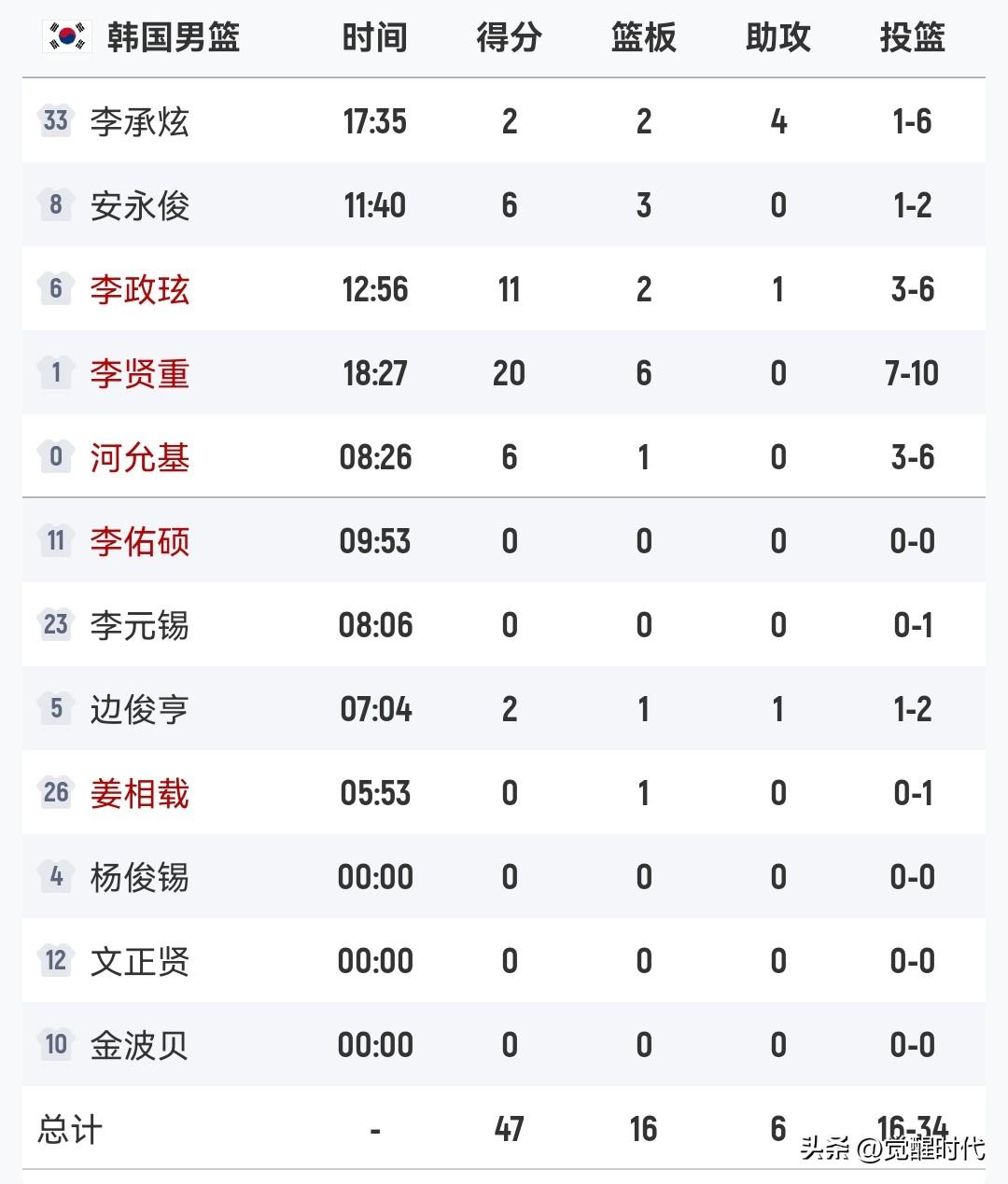 中国男篮76-79韩国球员打分 廖三宁9分 17+6 仅用4次出手 多次突破攻击杀伤对方 是中国男篮前段最好的也是难得的看点 当然失误还是有待控制 张镇麟 9分 全场最高分20+7 伤病复出 重归国家队 仍然具有创造力 还是让人眼前一亮 看到了些希望 状态来的晚了些 最后两个扳平比分的三分没进也是可惜 高诗岩 8分 6+ 尽管看着没啥亮眼 但在防守方面还是 串联方面 关键球处理方面 还是可圈可点