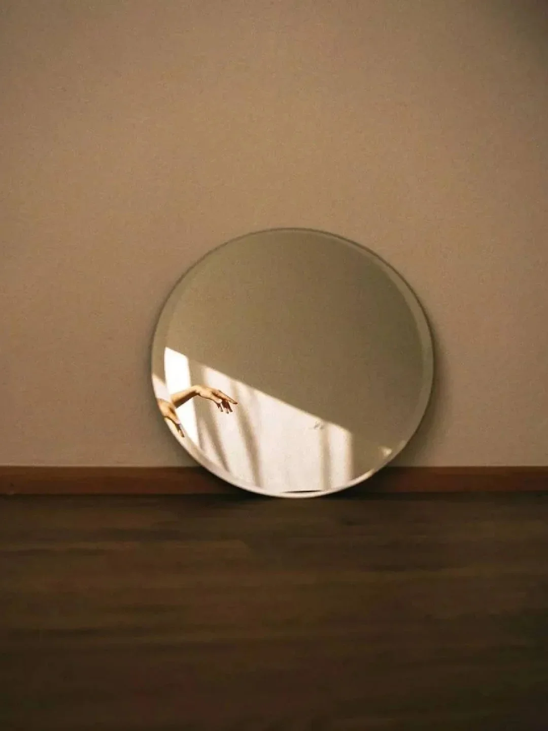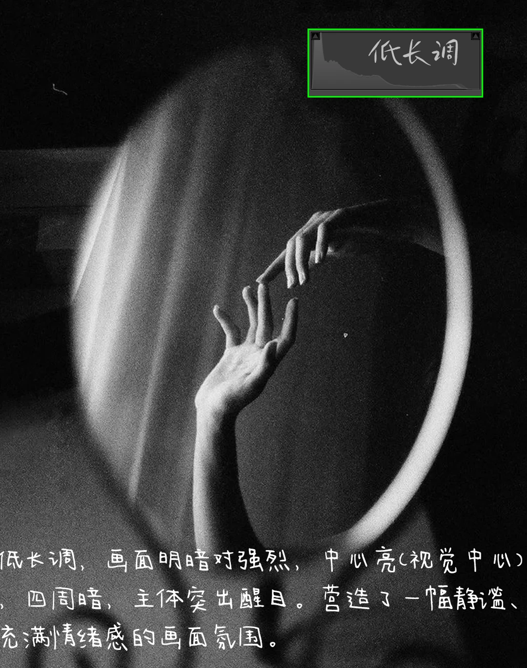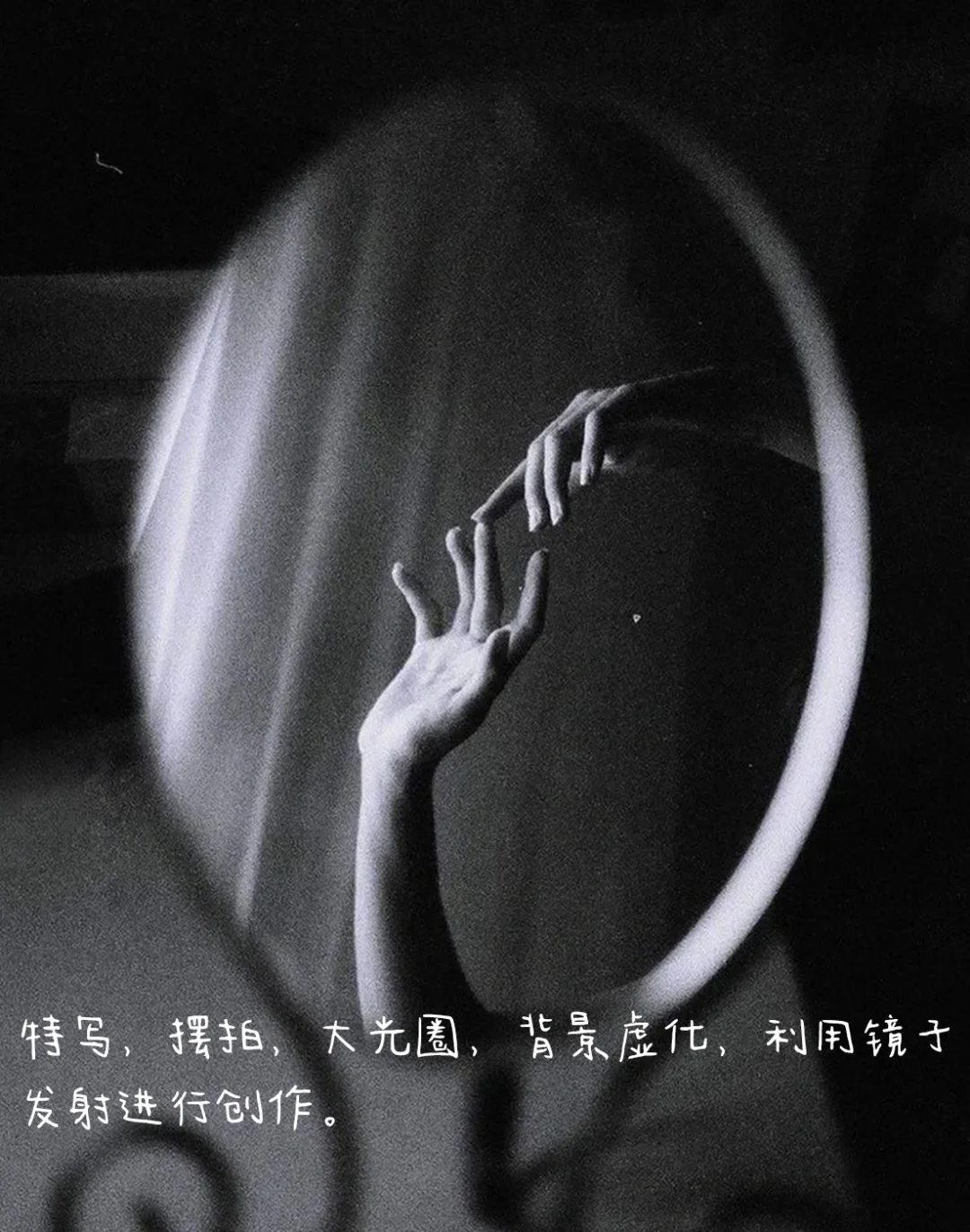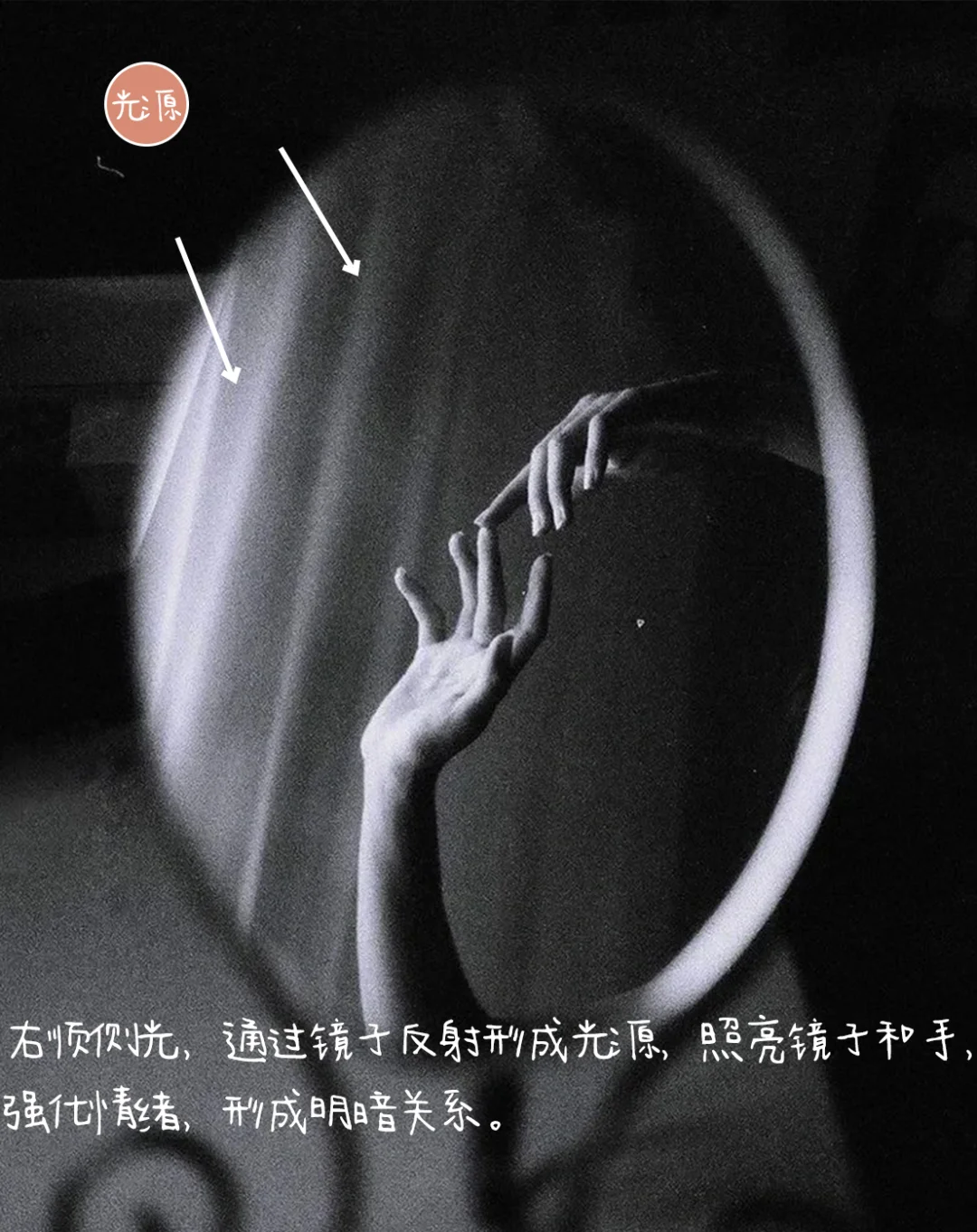 2.光线:右顺侧光,通过镜子反射形成光源,照亮镜子和手,强化情绪,形成明暗关系。
