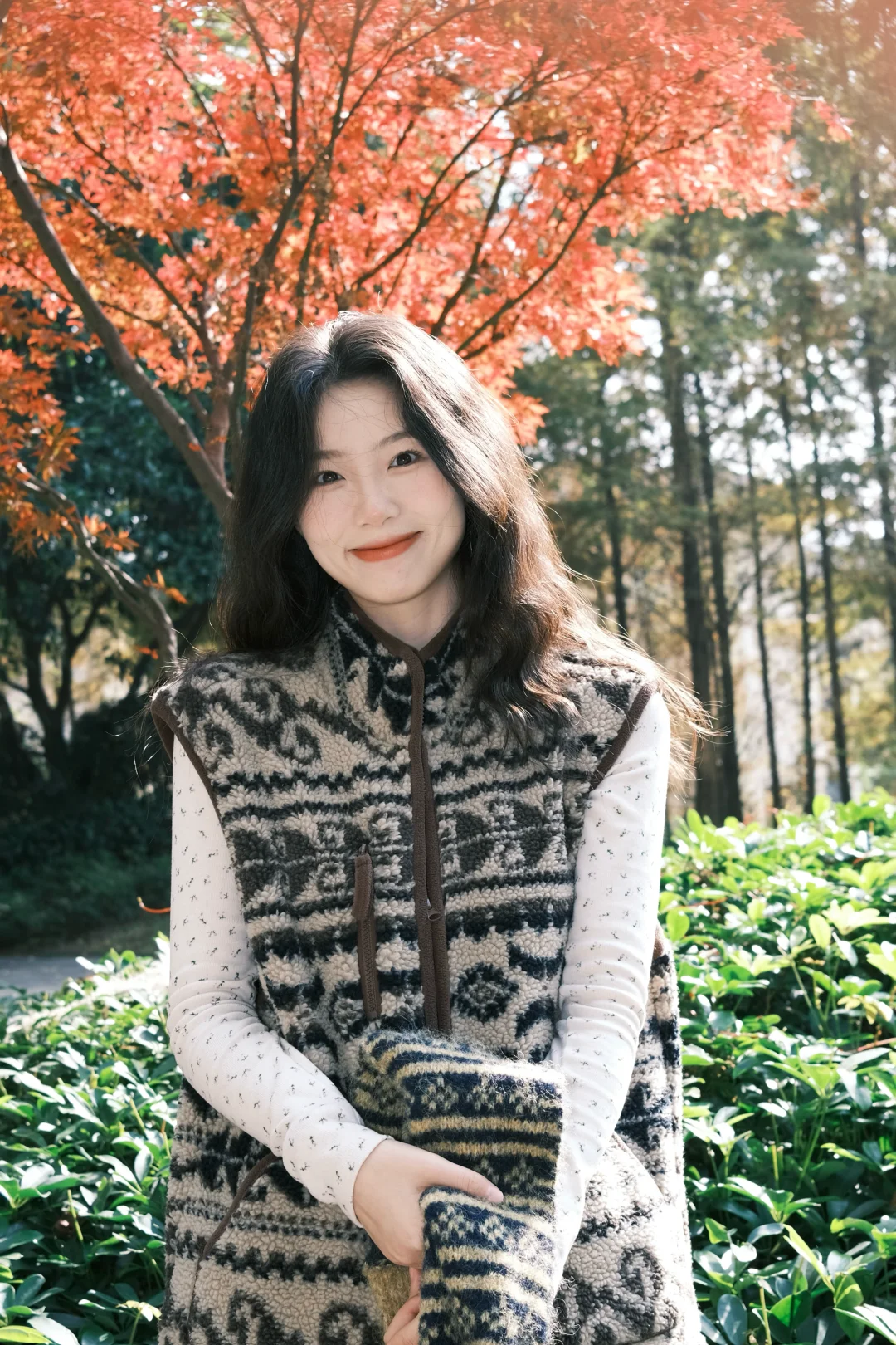运动后放松时刻,穿红色卫衣,享受宁静时光。