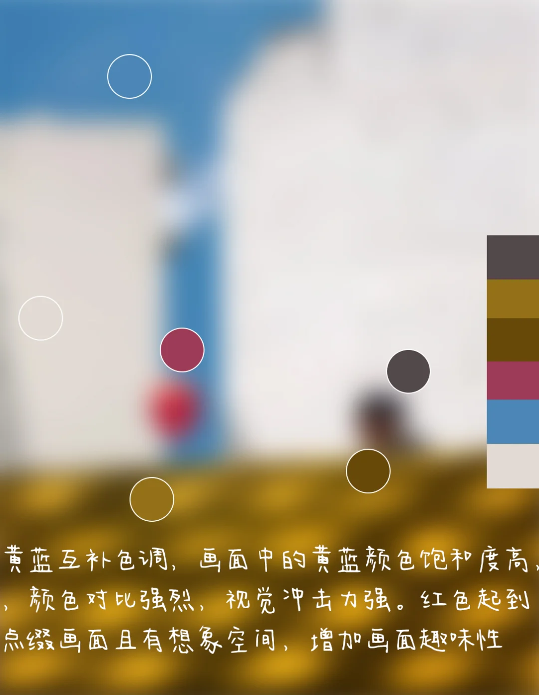 4.色彩:黄蓝互补色调,画面中的黄蓝颜色饱和度高,,颜色对比强烈,视觉冲击力强。红色起到点缀画面且有想象空间,增加画面趣味性。