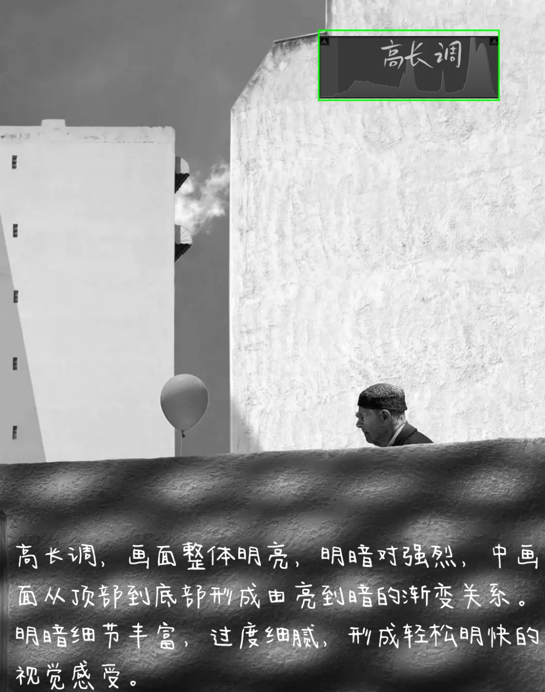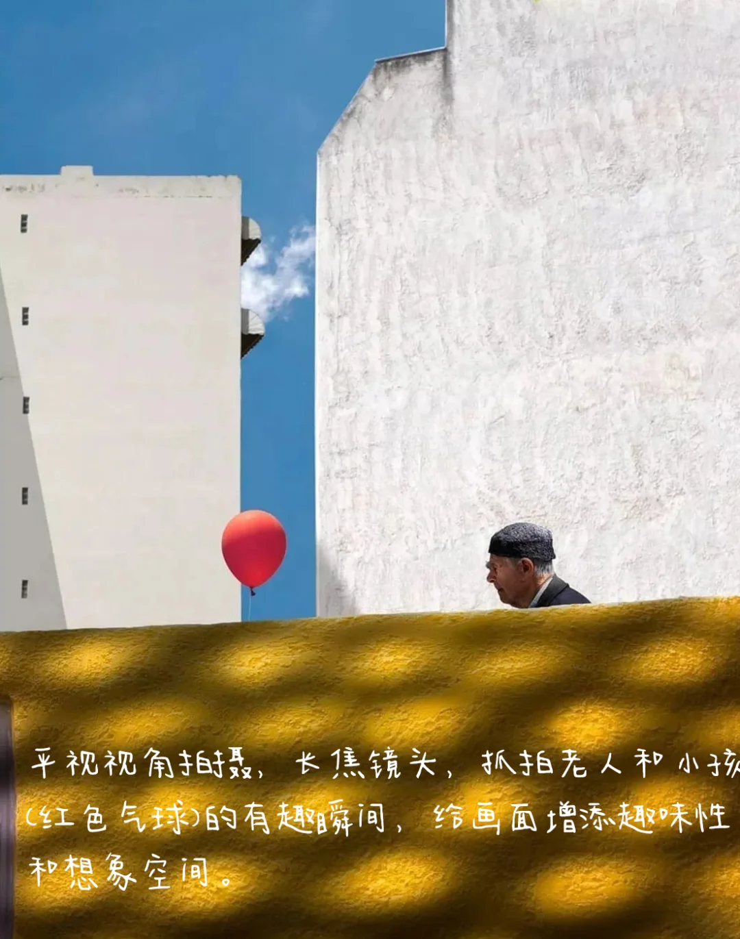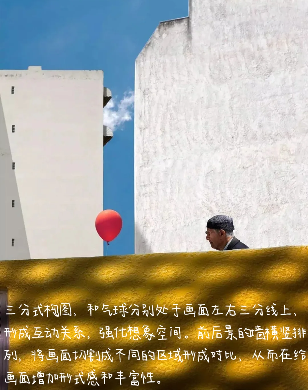 1.构图:三分式构图,和气球分别处于画面左右三分线上,形成互动关系,强化想象空间。前后景的墙横竖排列,将画面切割成不同的区域形成对比,从而在给画面增加形式感和丰富性。