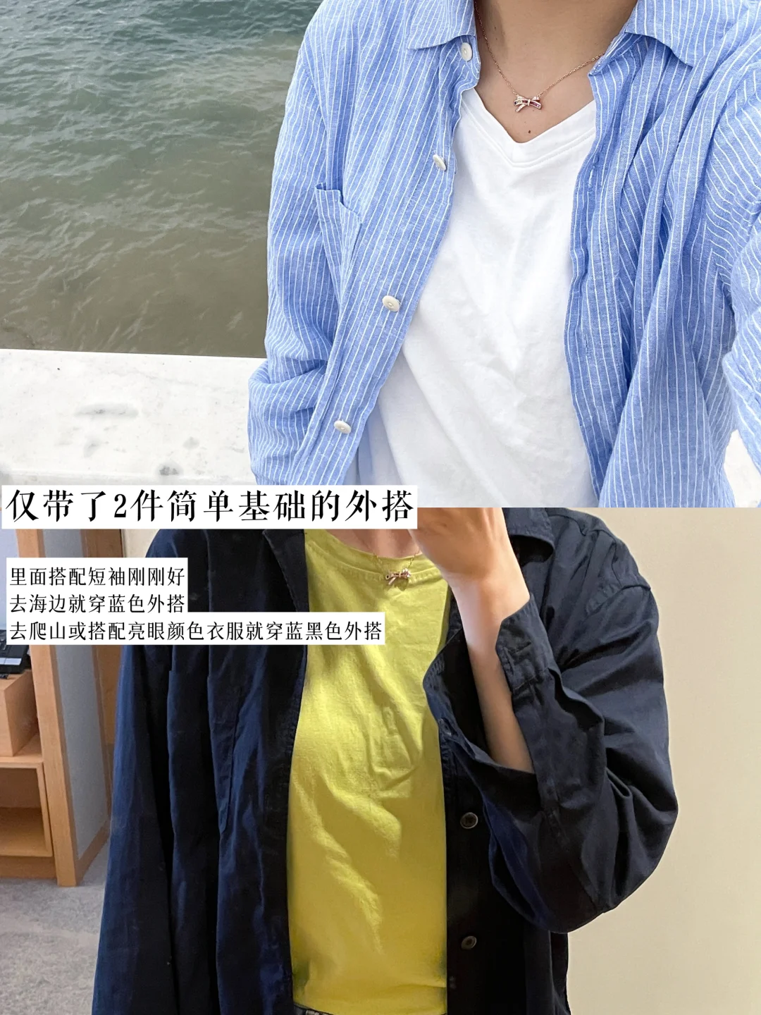 外出旅行捉摸不准天气,带着衬衫外搭能一衣多穿。我带了2件衬衫外搭,去海边就穿海蓝色条纹外搭,搭配海景真的很出片。去森林登山就穿黑色外搭,精简后越来越喜欢简单设计,不带多,衣服都能搭配。