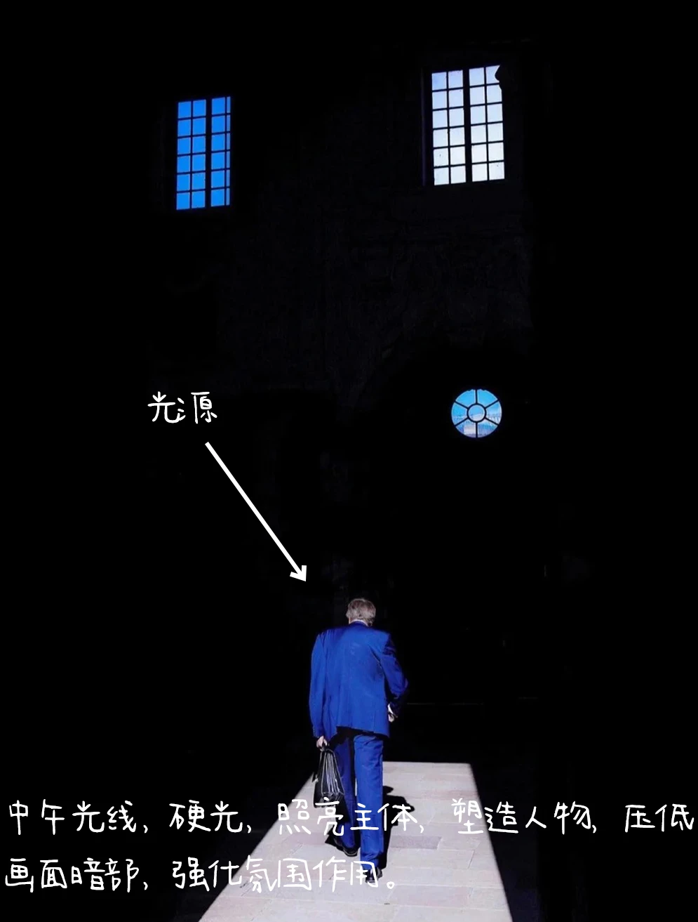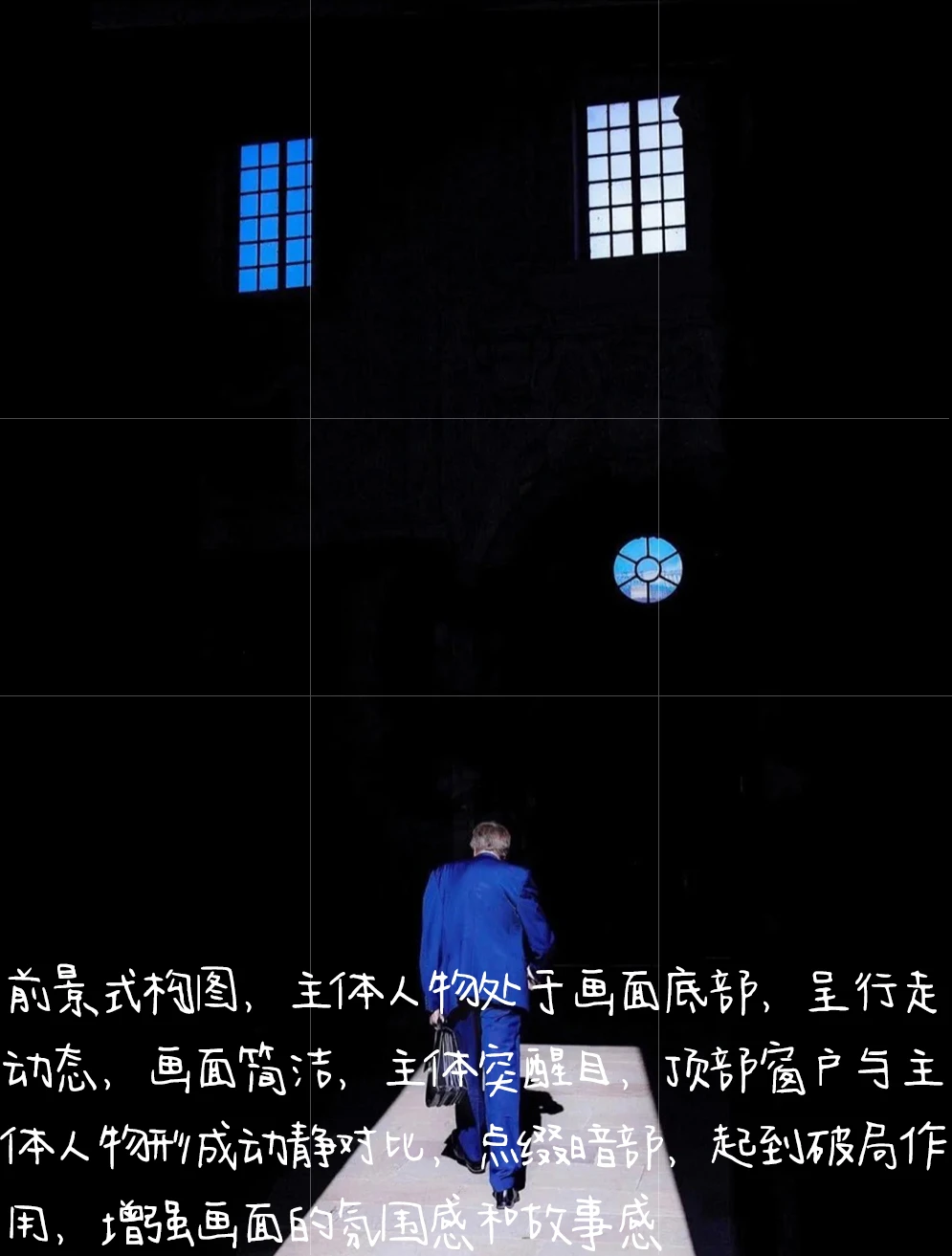 1.构图:前景式构图,主体人物处于画面底部,呈行走动态,画面简洁,主体突醒目,顶部窗户与主体人物形成动静对比,点缀暗部,起到破局作用,增强画面的氛围感和故事感。