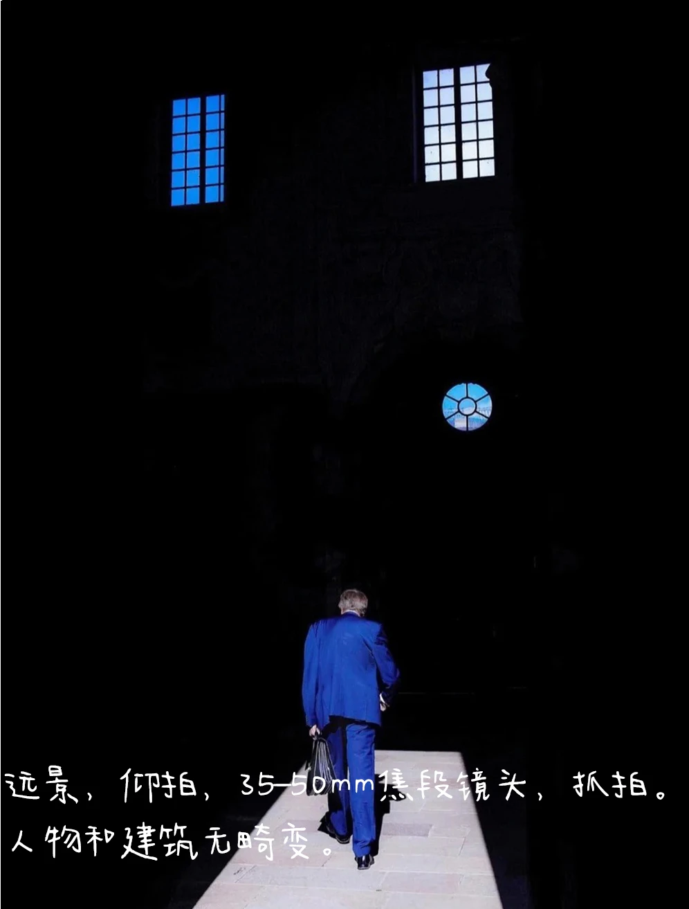 5.拍摄:远景,仰拍,35-50mm焦段镜头,抓拍,人物和建筑无畸变。